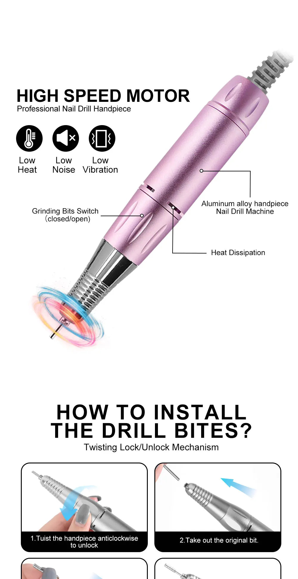 Eficient, compact și ușor de manevrat: Mânerul stiloului de găurit electric pentru unghii DC oferă viteze stabile și control ergonomic pentru îngrijirea precisă a unghiilor acasă și în studio.