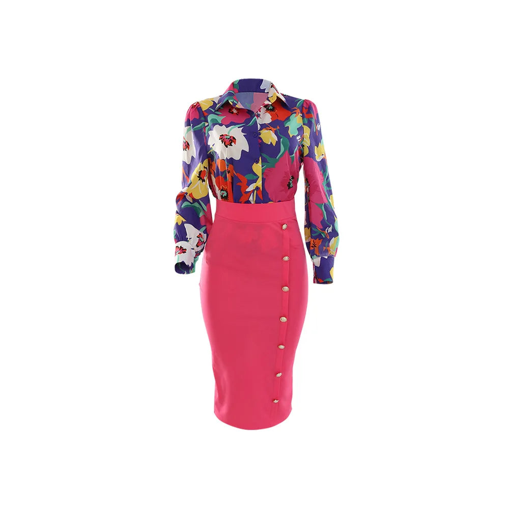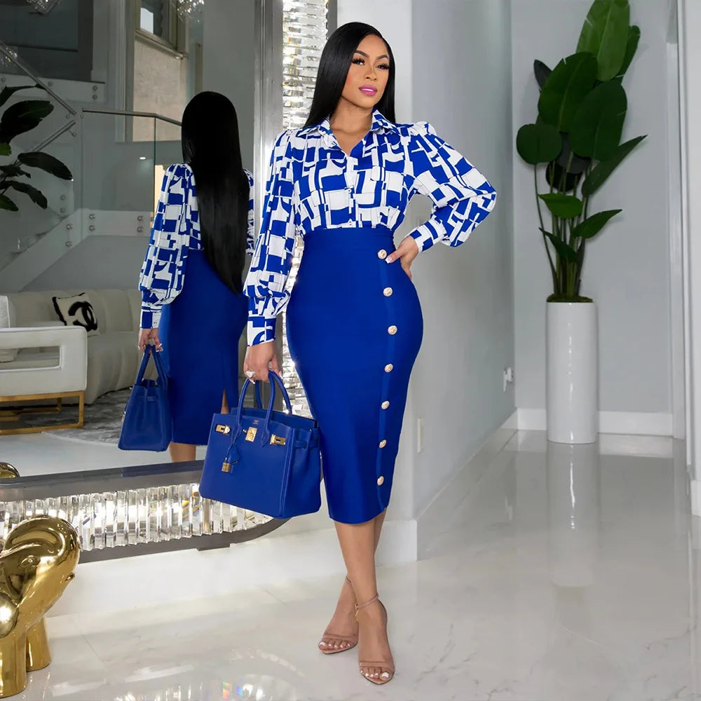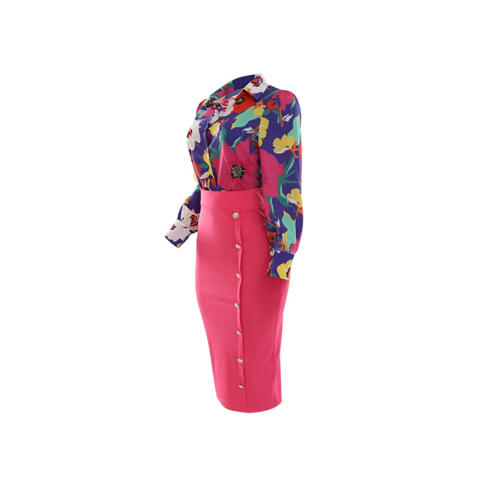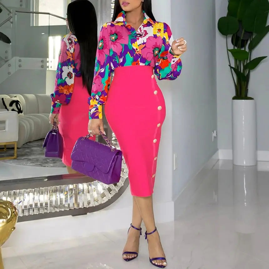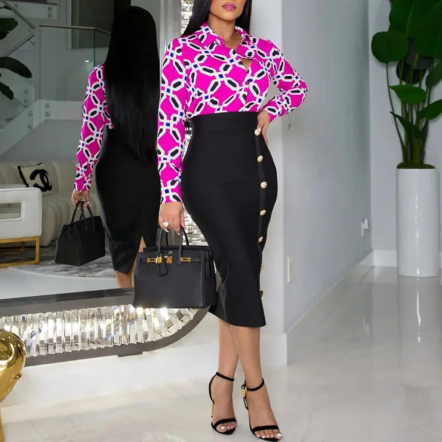 - Design curat și croit: Combinația dintre o bluză imprimată cu guler de cămașă și o fustă creion croită creează o siluetă îngrijită și profesională.
