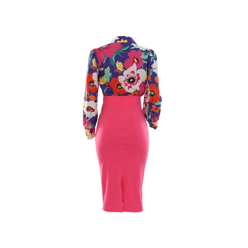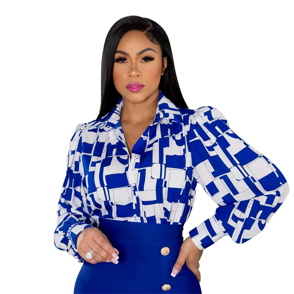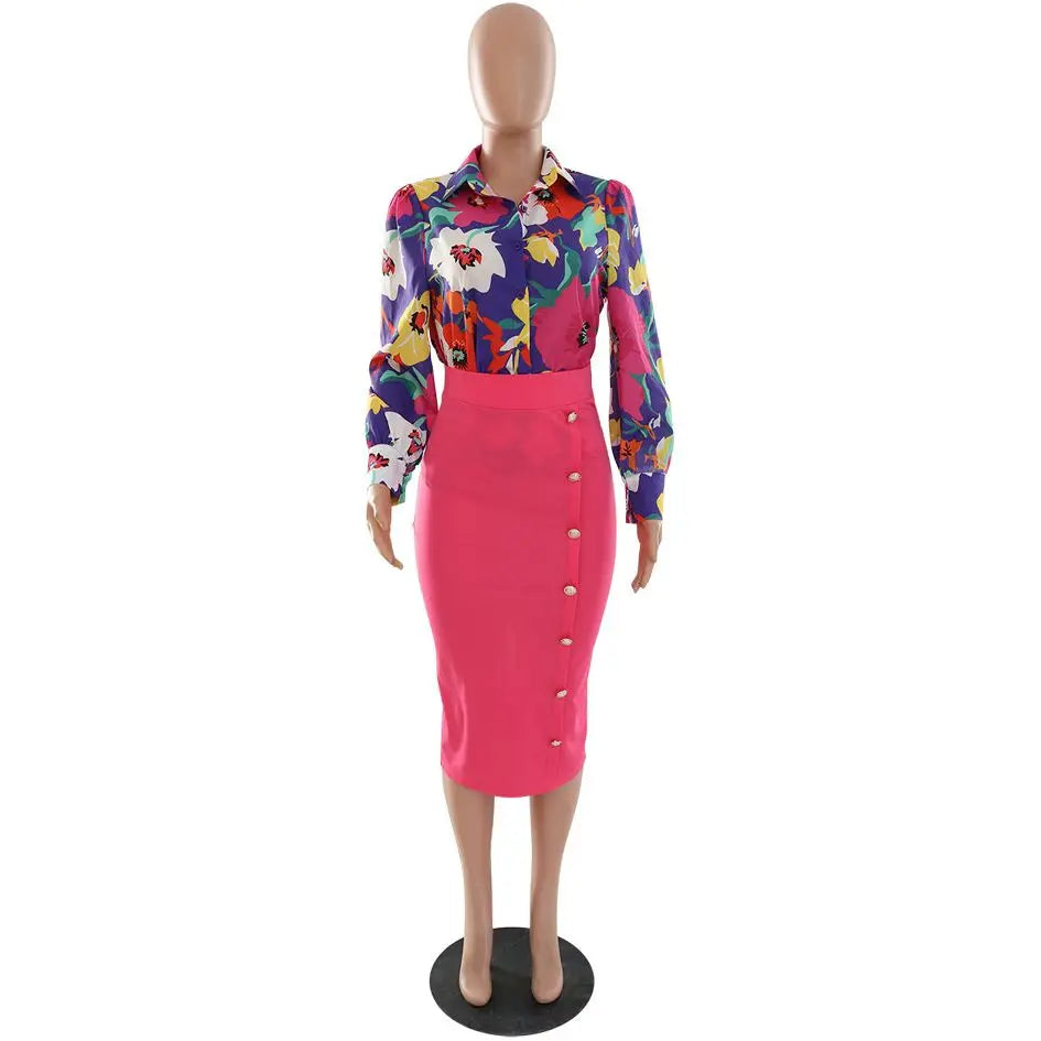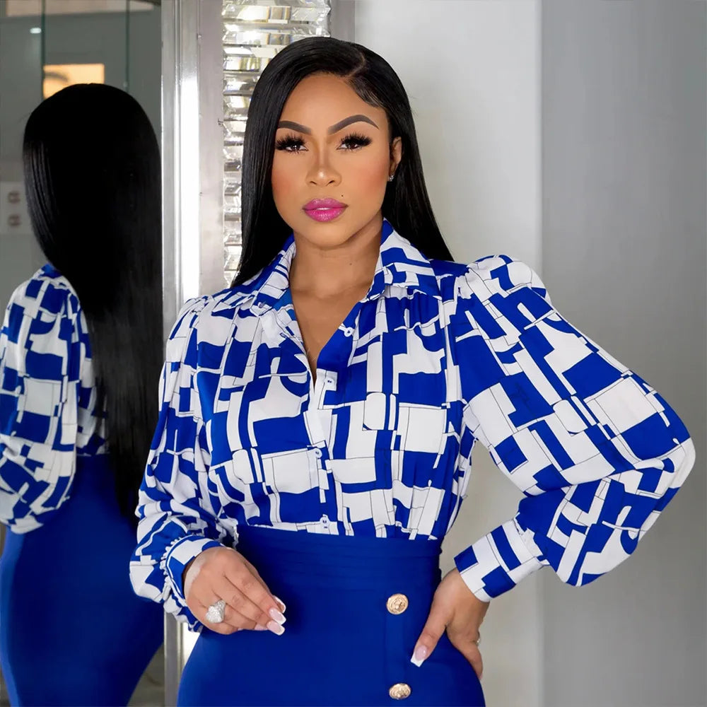 - Design curat și croit: Combinația dintre o bluză imprimată cu guler de cămașă și o fustă creion croită creează o siluetă îngrijită și profesională.