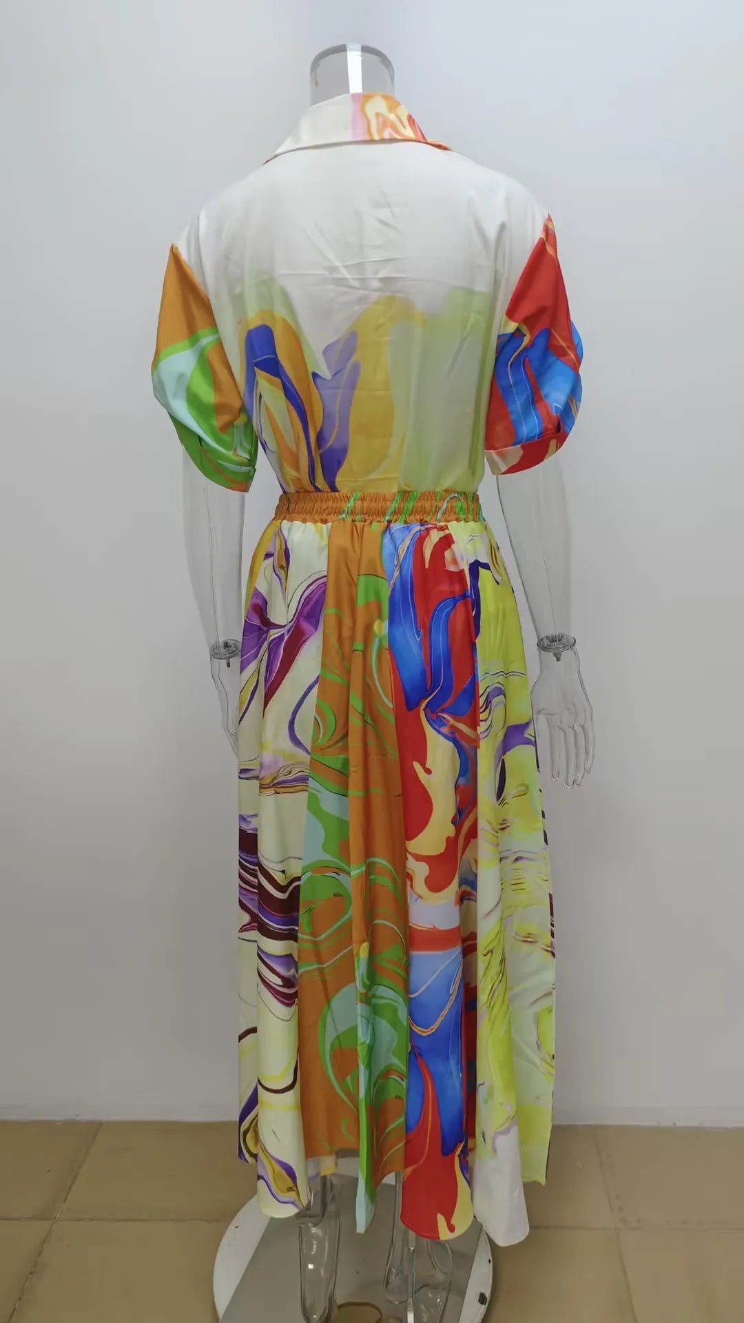 Acest set modern din 2 piese combină confortul cu un imprimeu feminin și o croială lejeră și măgulitoare — ideal pentru zilele călduroase și ocazii versatile.