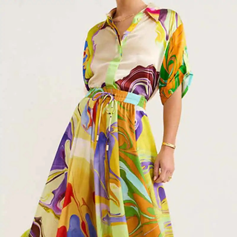 Seturi elegante de 2 piese pentru femei, vară, modă, imprimare, cămașă cu mânecă jumătate, costume casual, lejer, cu dantelă, talie înaltă, fustă, set
