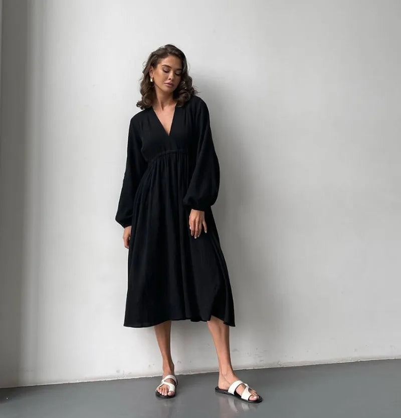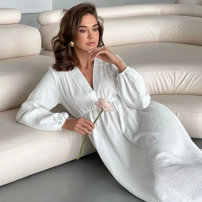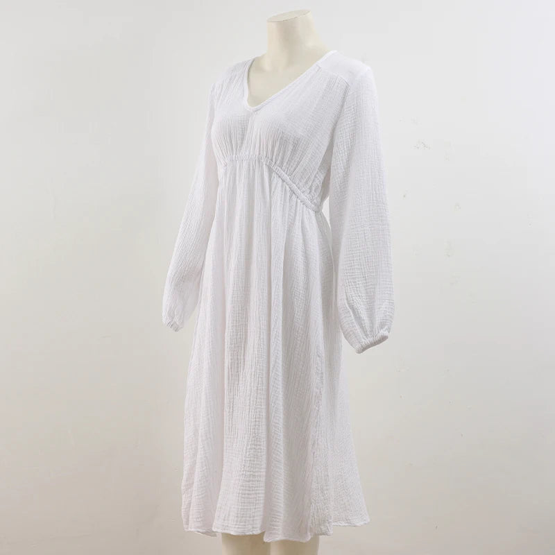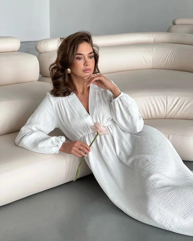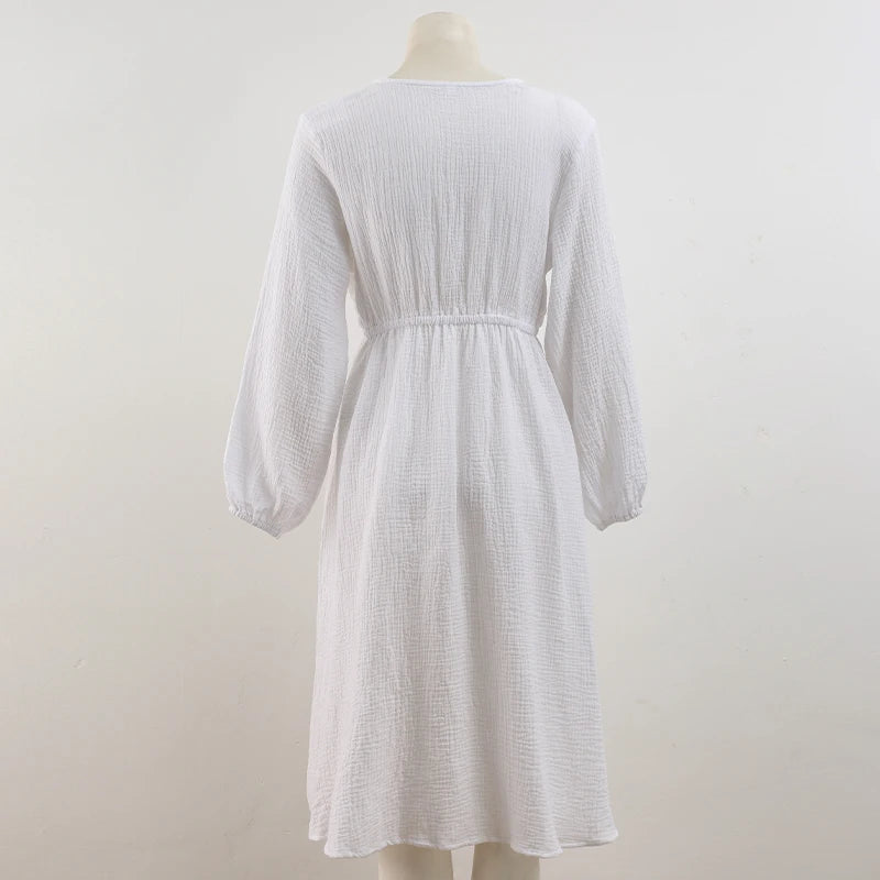 Rochii elegante pentru femei, 100% bumbac, muselină, mânecă lungă, decolteu în V, casual, petrecere, vacanță, plajă, alb, negru, halate, vestidos de mujer