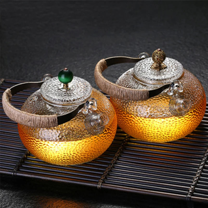 Ceainic de sticlă rezistent la temperaturi ridicate, set de ceai, ceainic de flori cu textură ciocănită manual, cu mâner pentru a face ceainic Gaiwan Pu Erh