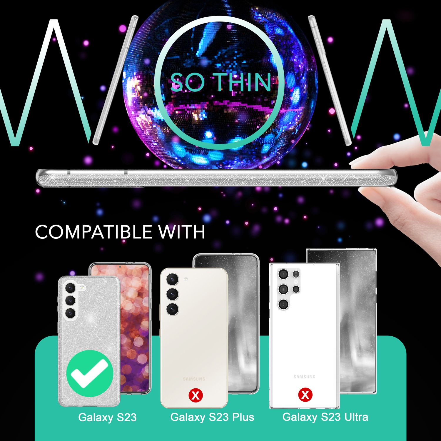 Carcasă hibridă din silicon cu sclipici pentru Samsung Galaxy S23, 2x folii de protecție pentru ecran