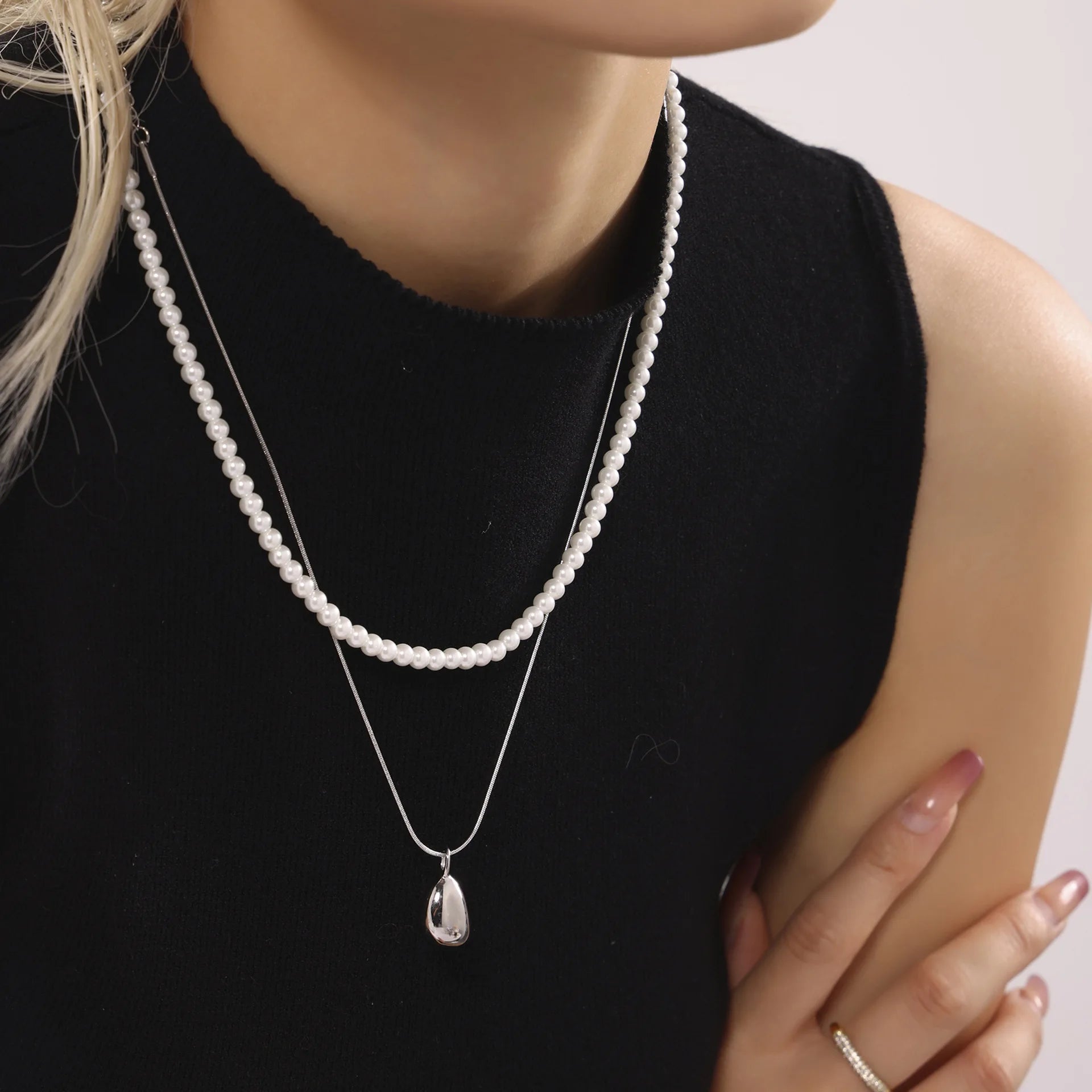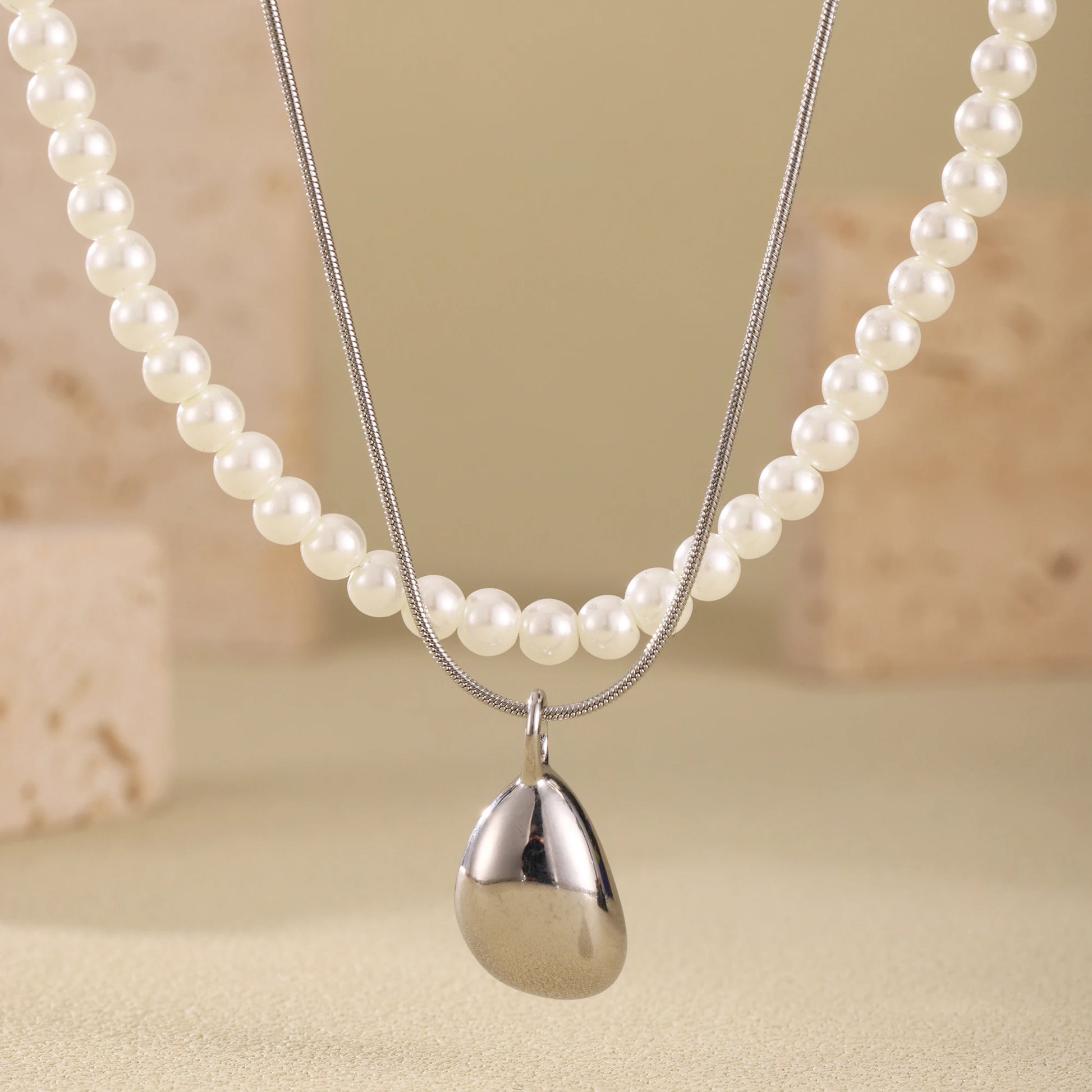 - Culoare: Alb (perle) și auriu (lanț/pandantiv)
