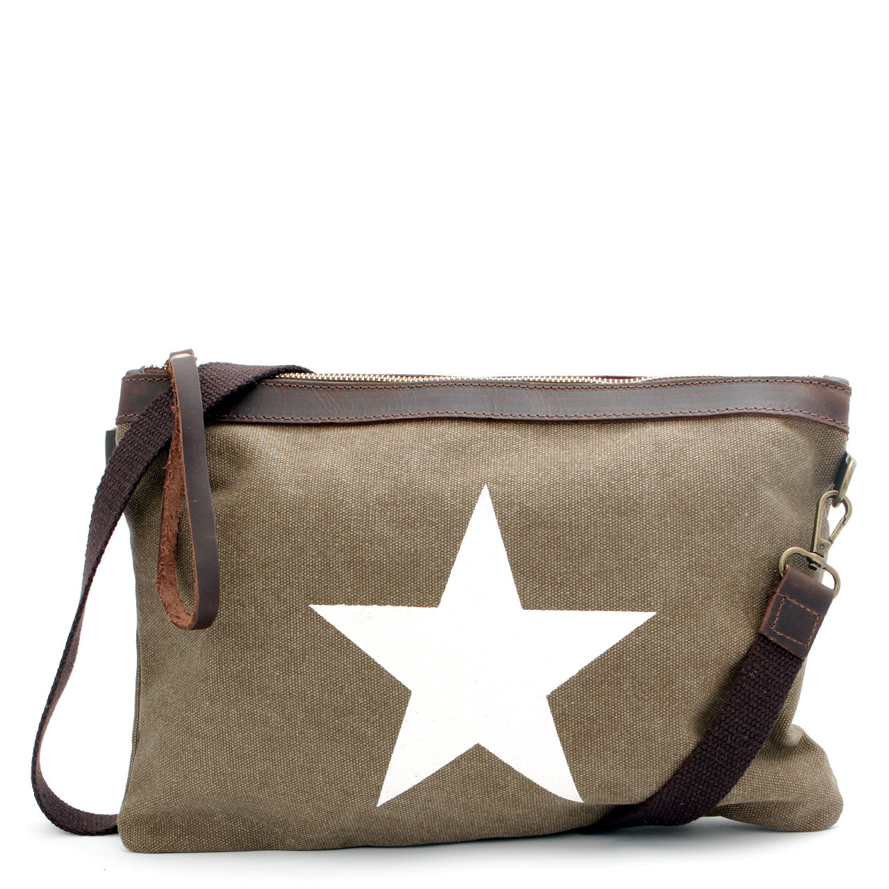 Modische Beuteltasche mit angesagtem Stern Motiv in braun mit braunen Lederaplikationen. Obermaterial Stoff mit Lederapplikationen, mit 3 Innentaschen, Reißverschluss, Tragegurt, Breite ca. 33 cm und Höhe ca.24, Innenfutter 100% Polyester, Made in Italy.
