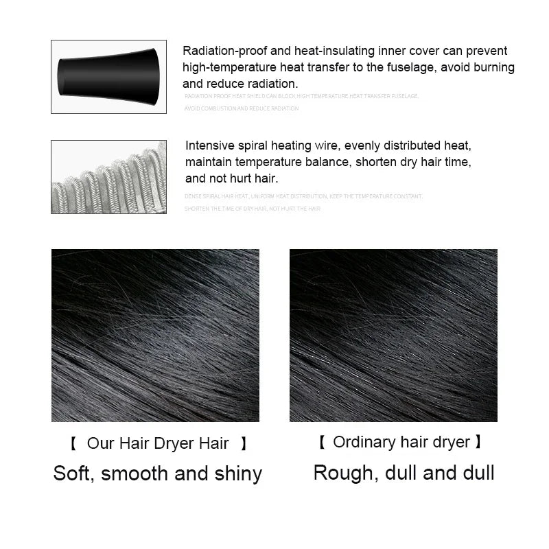 - Fluxul de aer puternic combinat cu tehnologia duzei concentrate reduce încrețirea și promovează uscarea uniformă de la rădăcini până la vârfuri.