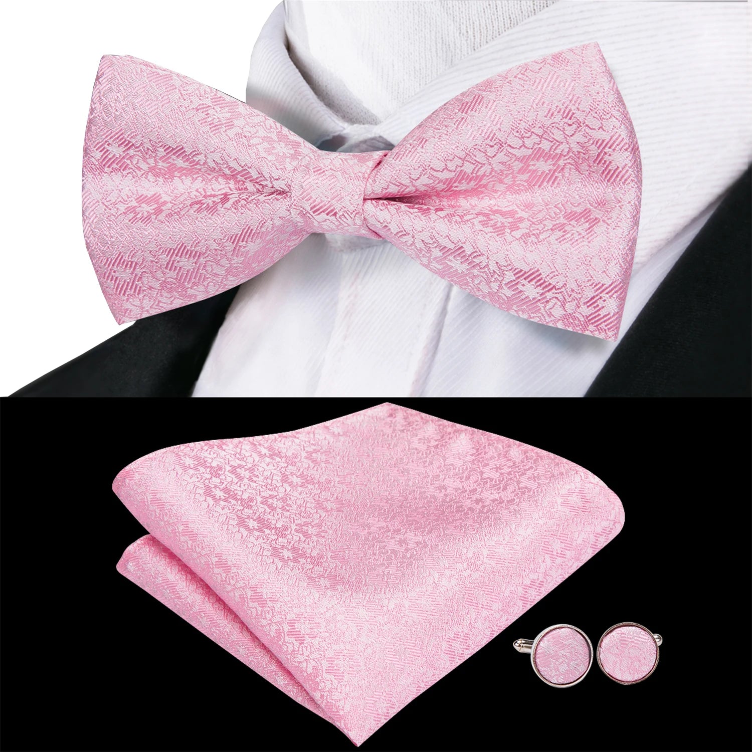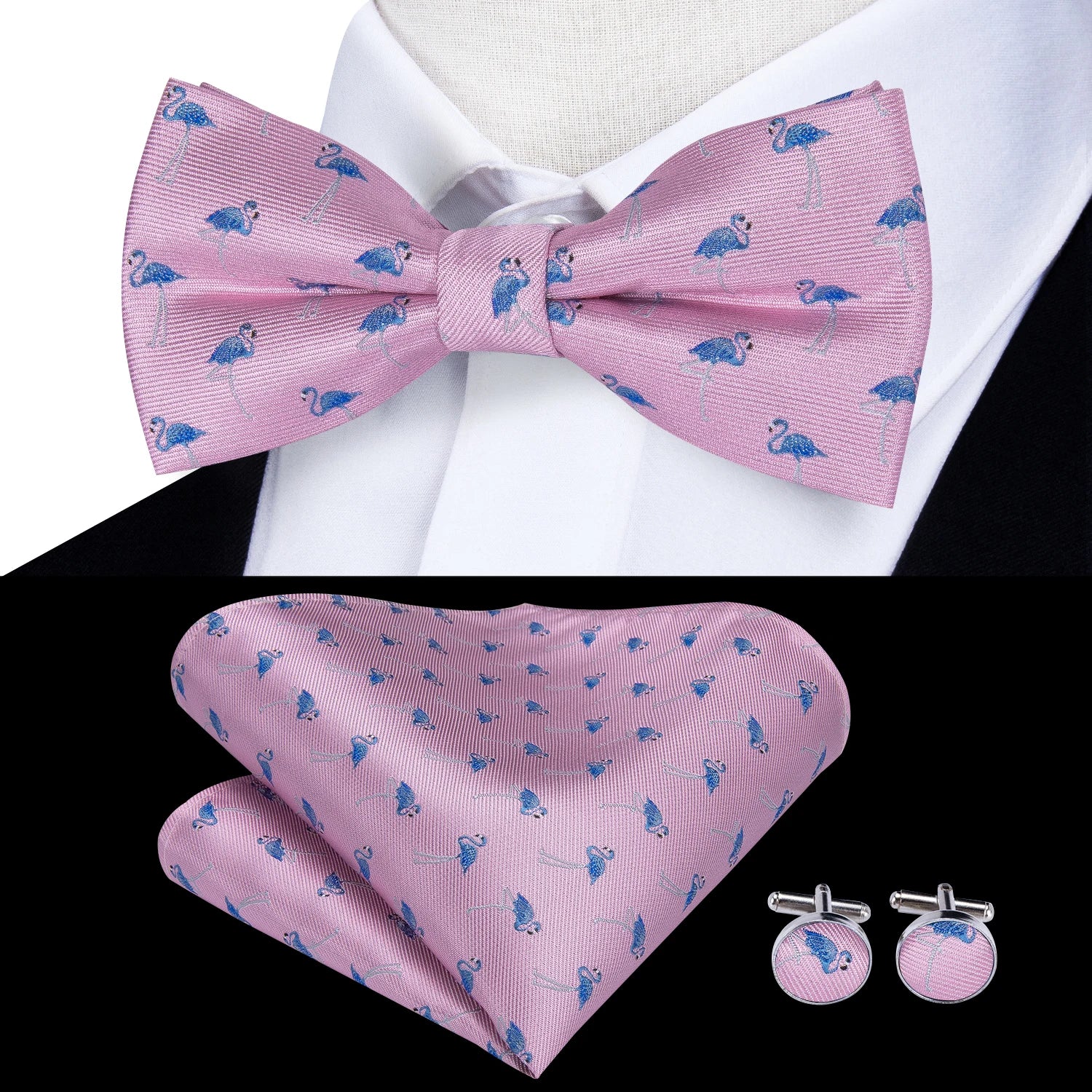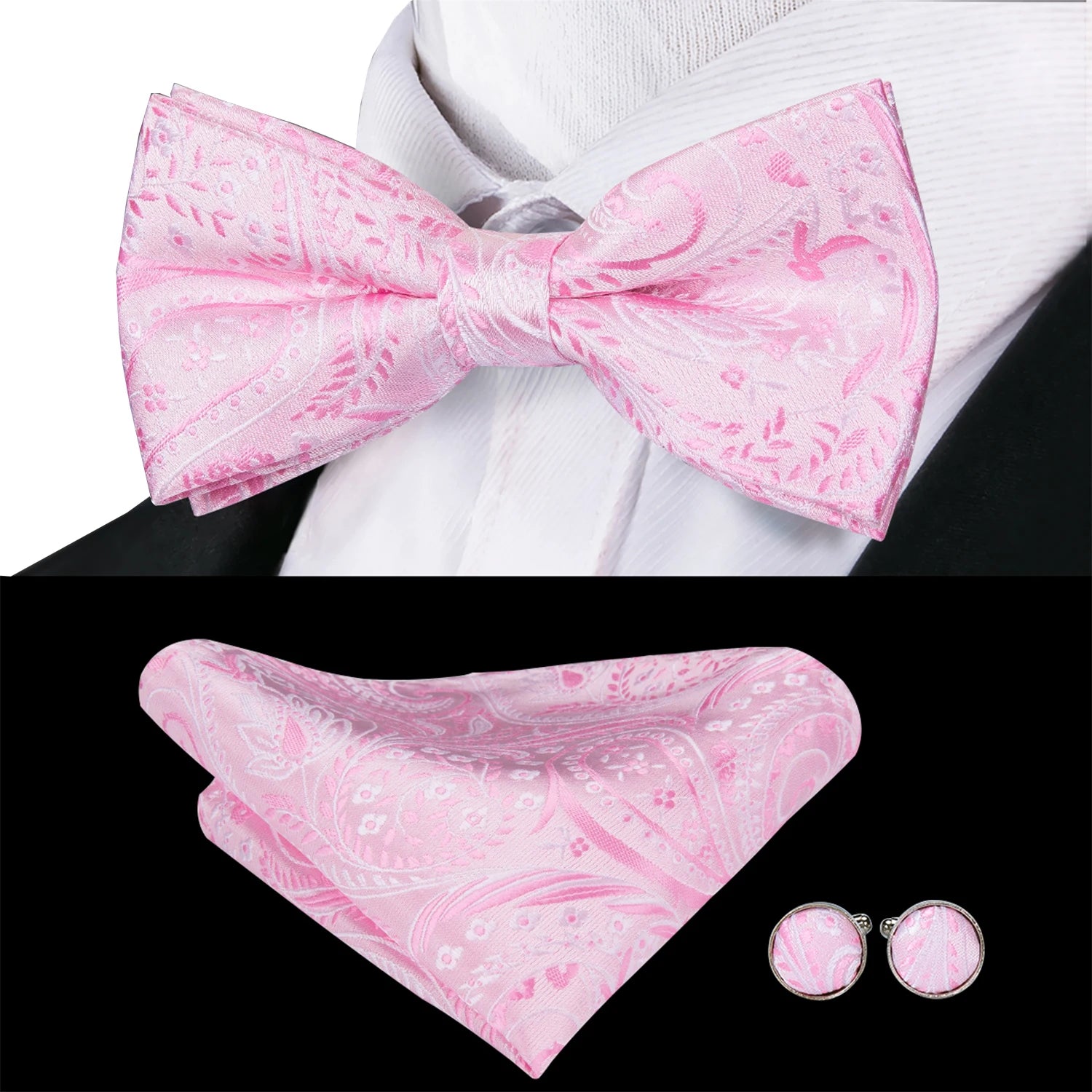- Piese incluse: papion pre-legat, batistă de buzunar și butoni