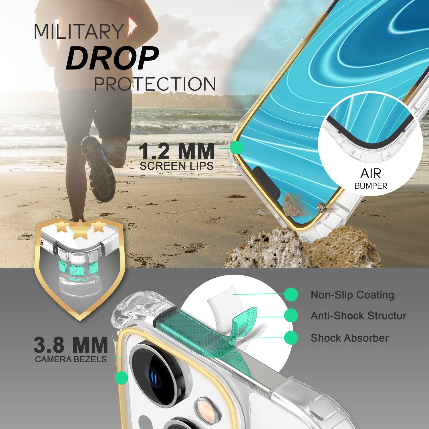 Tehnologia avansată de pernă de aer oferă protecție maximă prin absorbția eficientă a șocurilor. Colțurile ranforsate oferă protecție suplimentară în caz de căderi, în timp ce spatele robust din policarbonat de înaltă calitate oferă stabilitate. În ciuda nivelului ridicat de protecție, carcasa rămâne subțire și discretă.