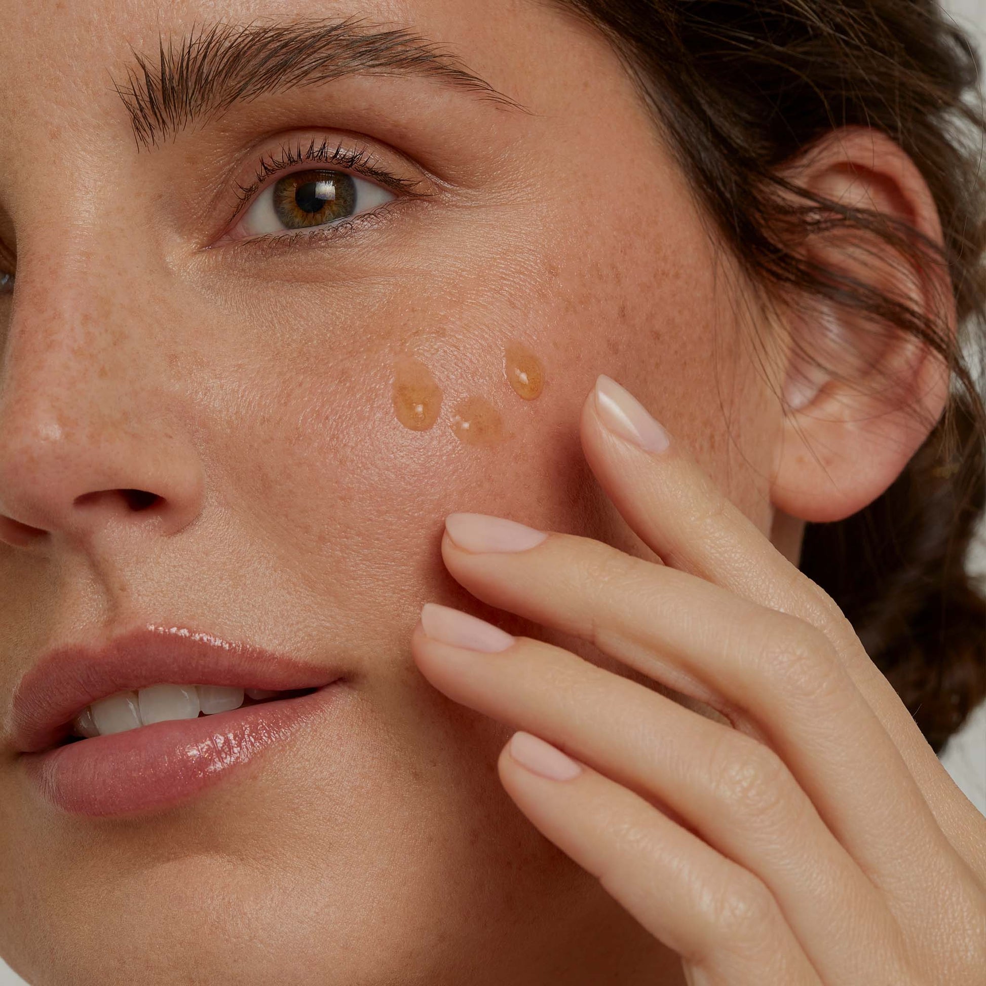 Puneți două-trei picături de ser hialuronic din pipetă pe vârful degetelor și aplicați-l pe față, gât și decolteu. Masați ușor serul în piele, apoi aplicați crema hidratantă.