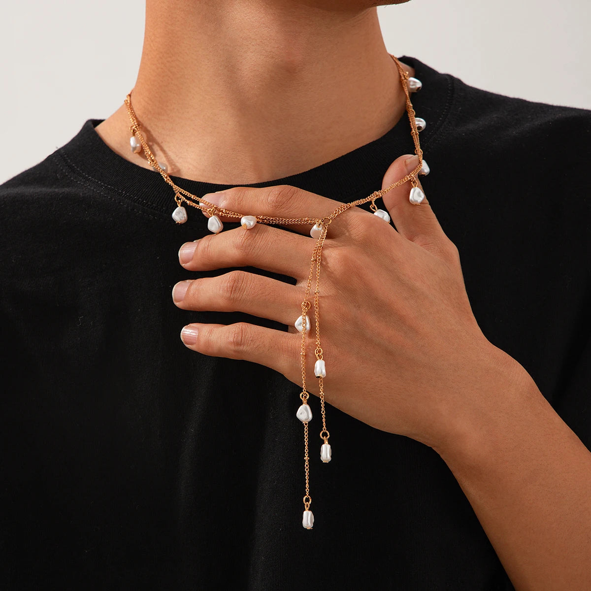 Acest colier lung cu perle imitație neregulate și un ciucure de cupru este un accesoriu versatil în categoria colierelor. Combină designul creativ cu caracteristici practice, oferind confort la purtare și sporind versatilitatea ținutelor tale. Datorită designului său unisex, este o alegere atractivă atât pentru bărbați, cât și pentru femei, ideal pentru o purtare modernă de zi cu zi și pentru look-uri speciale.