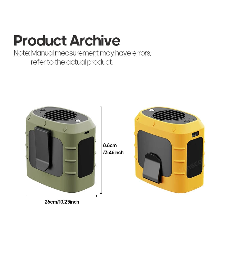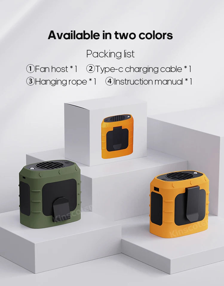Ventilatorul portabil de talie pentru exterior KINSCOTER combină o răcire puternică, o iluminare LED puternică și o baterie externă de 8000 mAh într-un dispozitiv durabil și ușor de transportat - ideal pentru camping, drumeții și activități în aer liber.