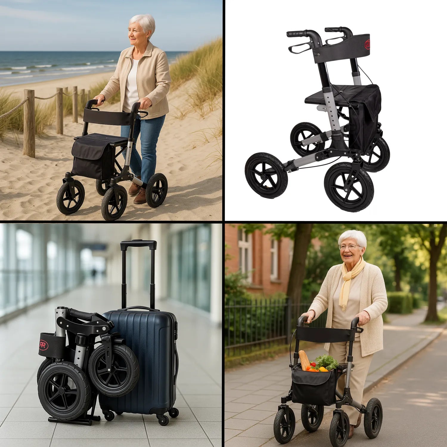 - Rollator de călătorie: Se potrivește în portbagajul unei mașini, trenului sau compartimentului avionului.