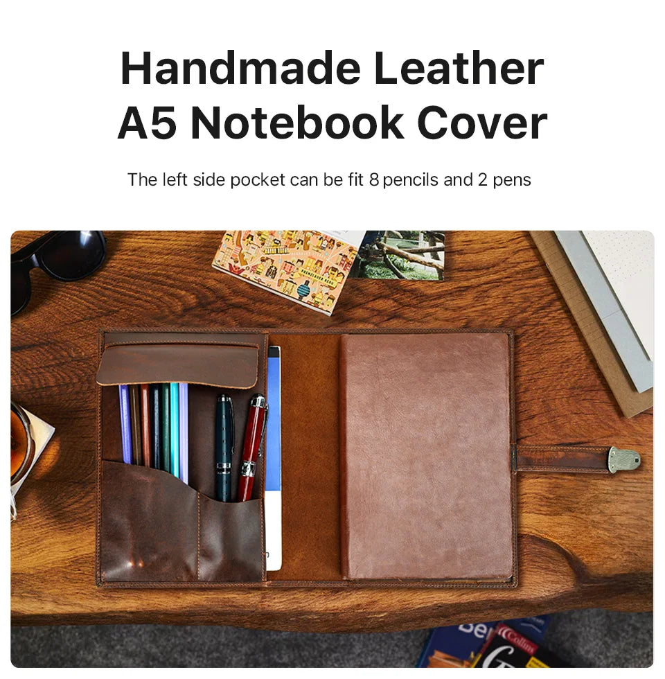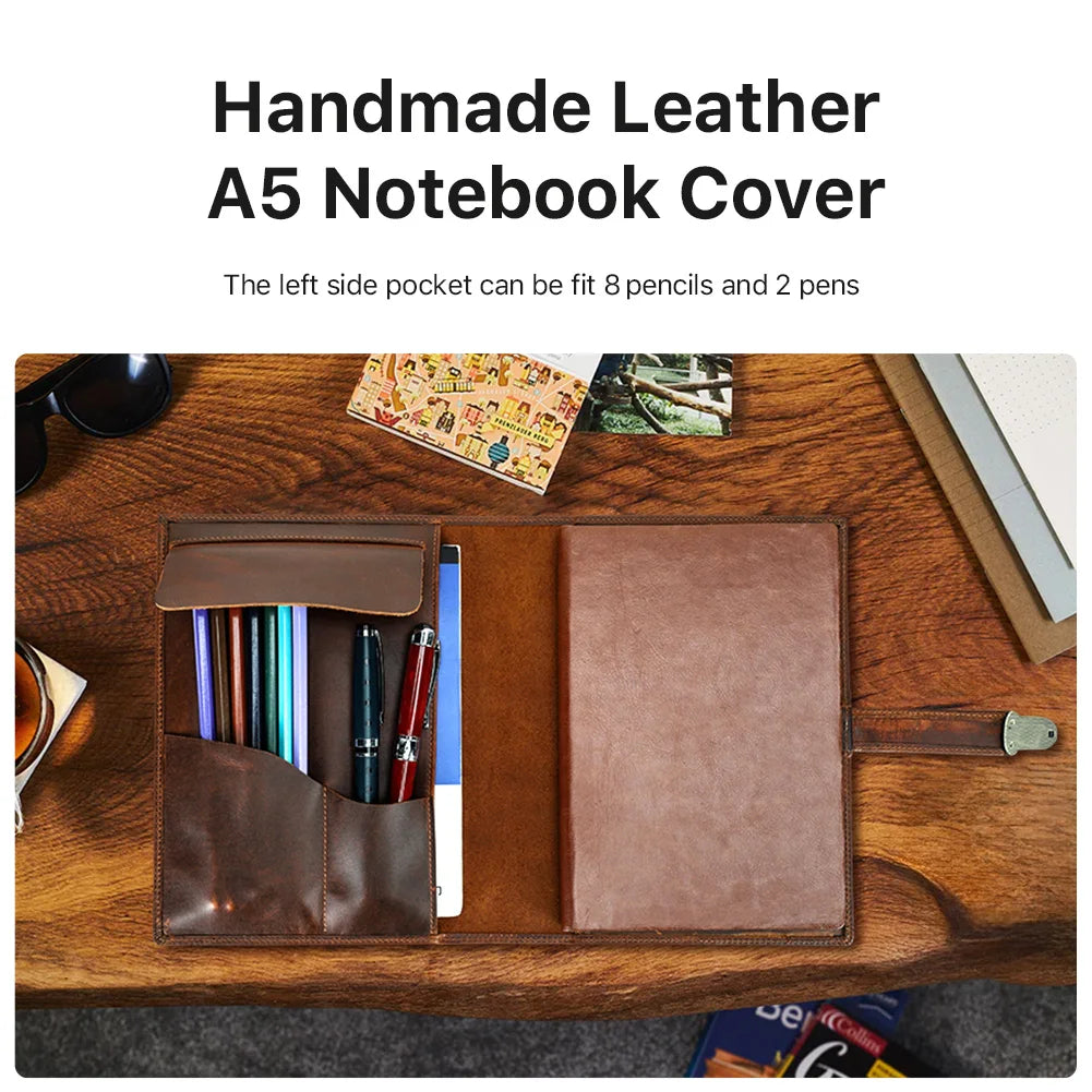 Husă de caiet A5 din piele de înaltă calitate, care vă protejează în siguranță notițele și vă îmbogățește viața de zi cu zi cu un stil clasic și o funcționalitate practică.