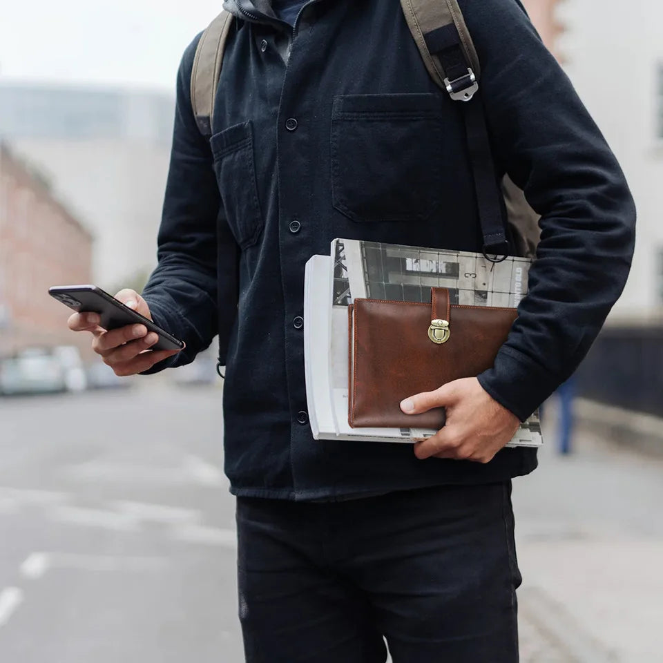 - Caracteristici speciale: Suport integrat pentru pix, compartimente interioare pentru carduri și documente