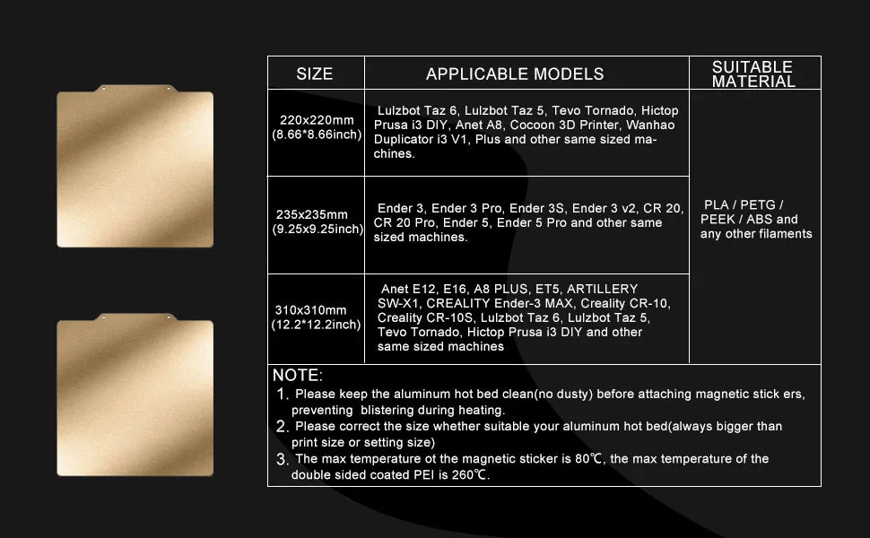 - Disponibil în mai multe dimensiuni standard (220x220 mm, 235x235 mm, 310x310 mm) pentru adaptare directă la modelele comune de imprimante precum Anet, Ender-3 și Prusa i3.