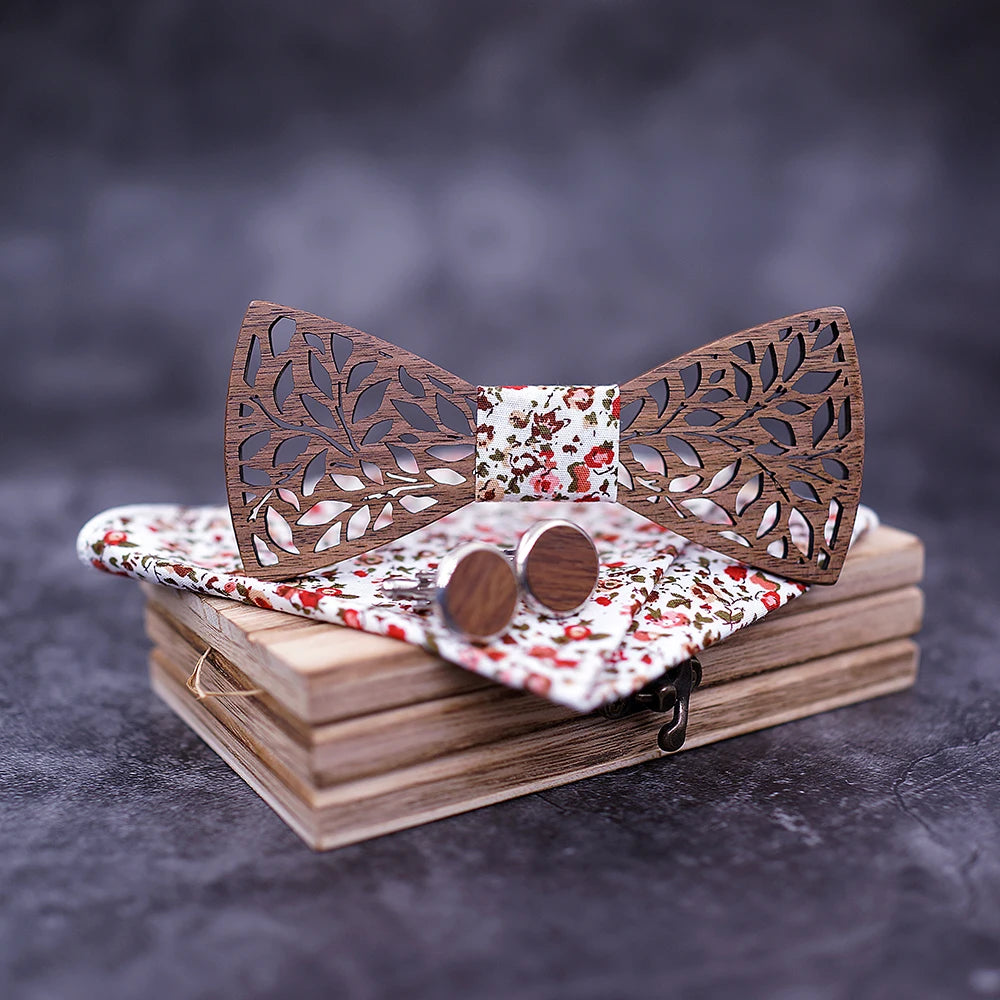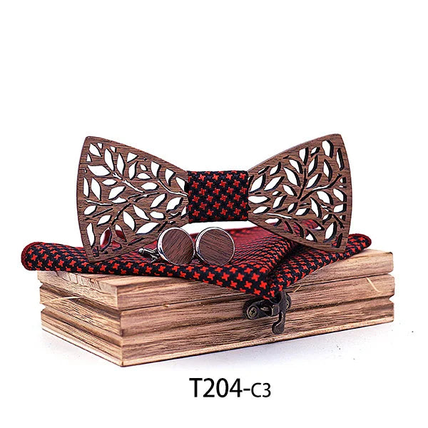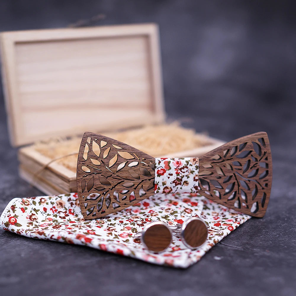 Set bărbătesc Mahoosive Fashion: Papion din lemn lucrat manual cu batistă de buzunar și butoni – Elegant și ușor de întreținut