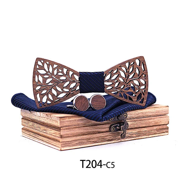 - Tip produs: Set complet format din papion din lemn pre-legat, batistă de buzunar și butoni