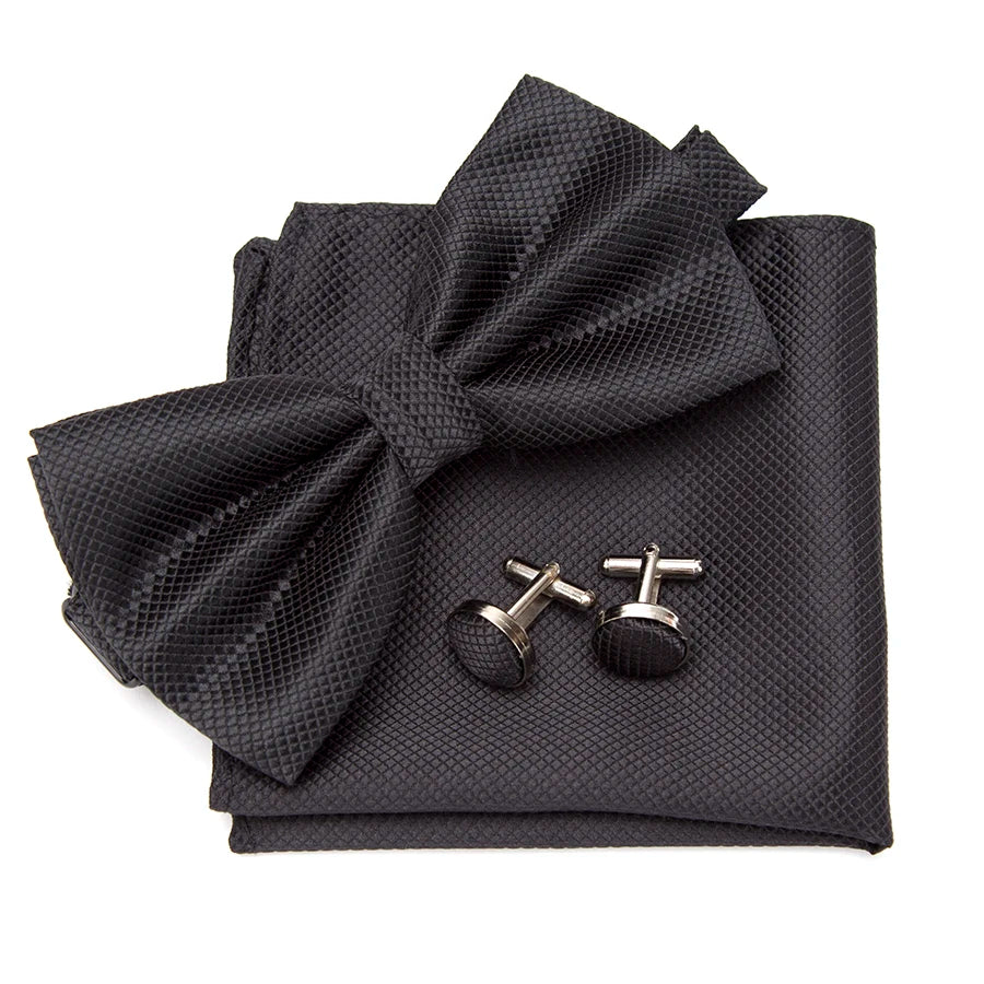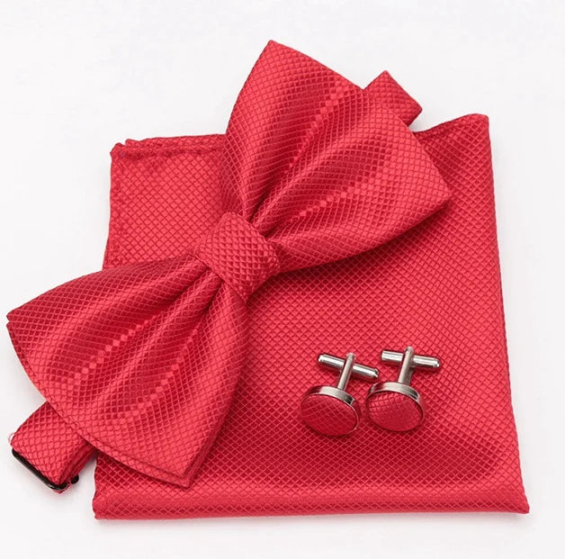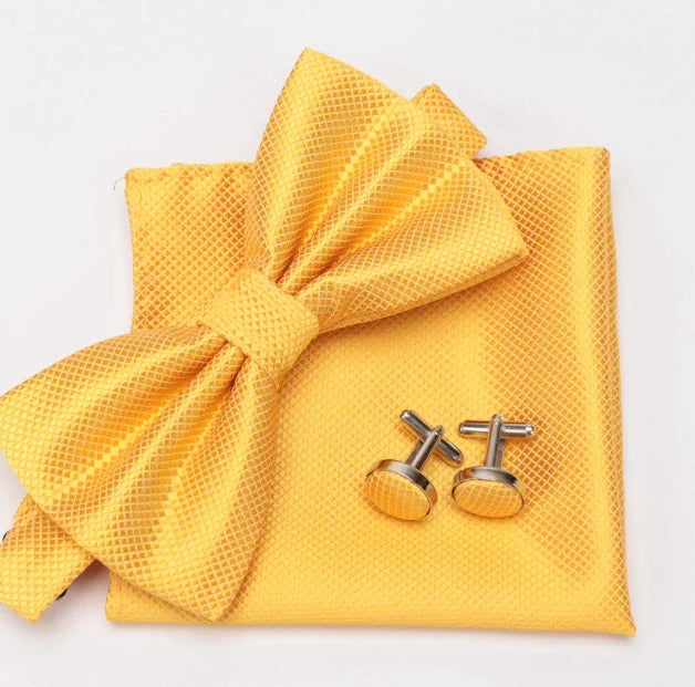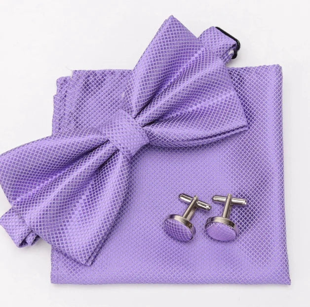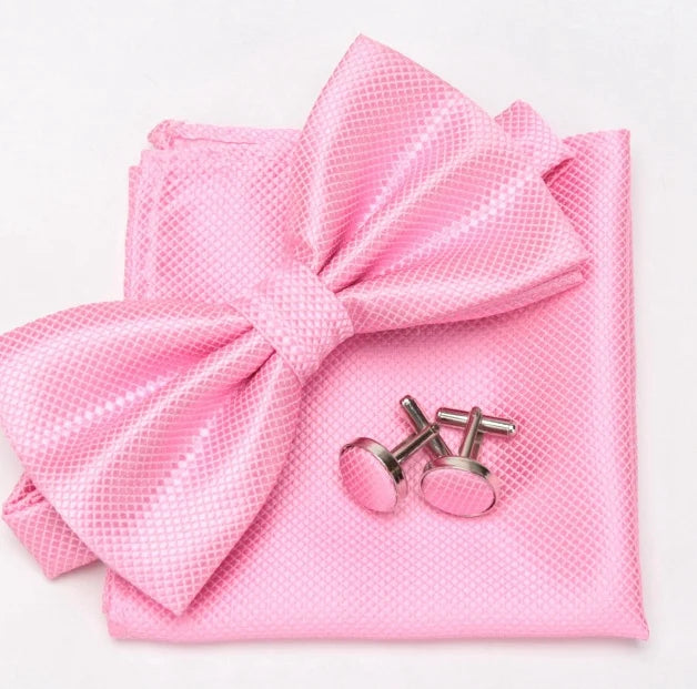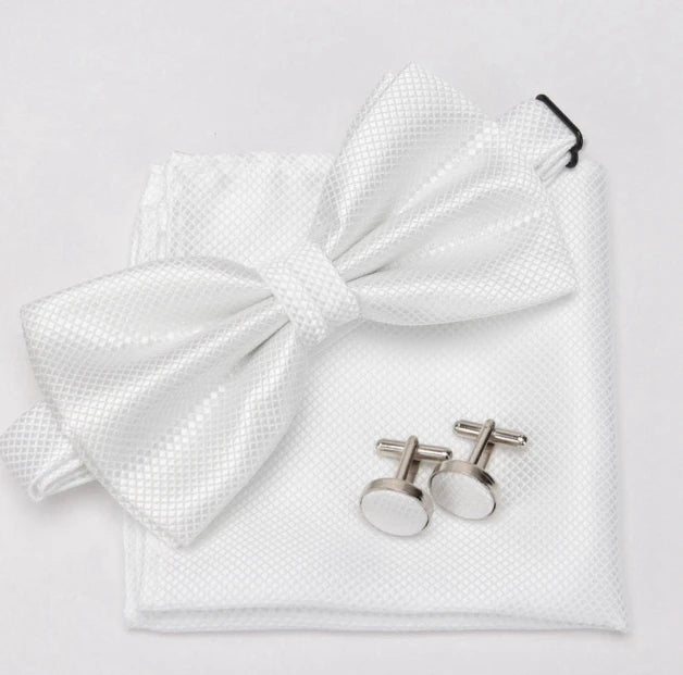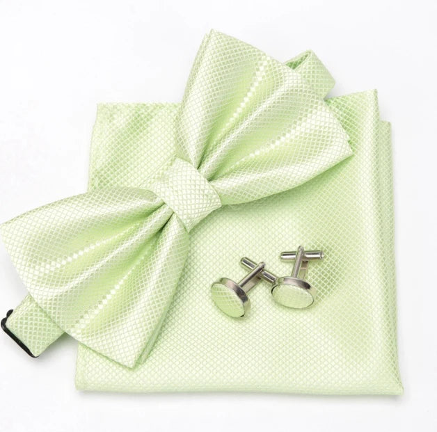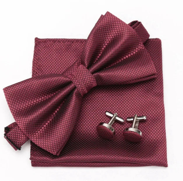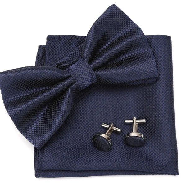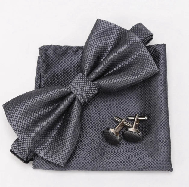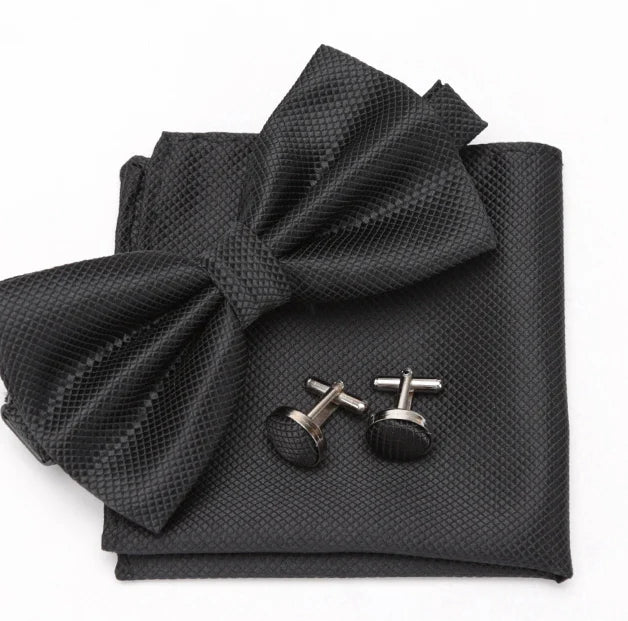 Un set complet de papion, agrafă de cravată, batistă de buzunar și butoni – perfect coordonate pentru nunți, petreceri sau ocazii speciale, transmițând instantaneu o impresie îngrijită și profesională.
