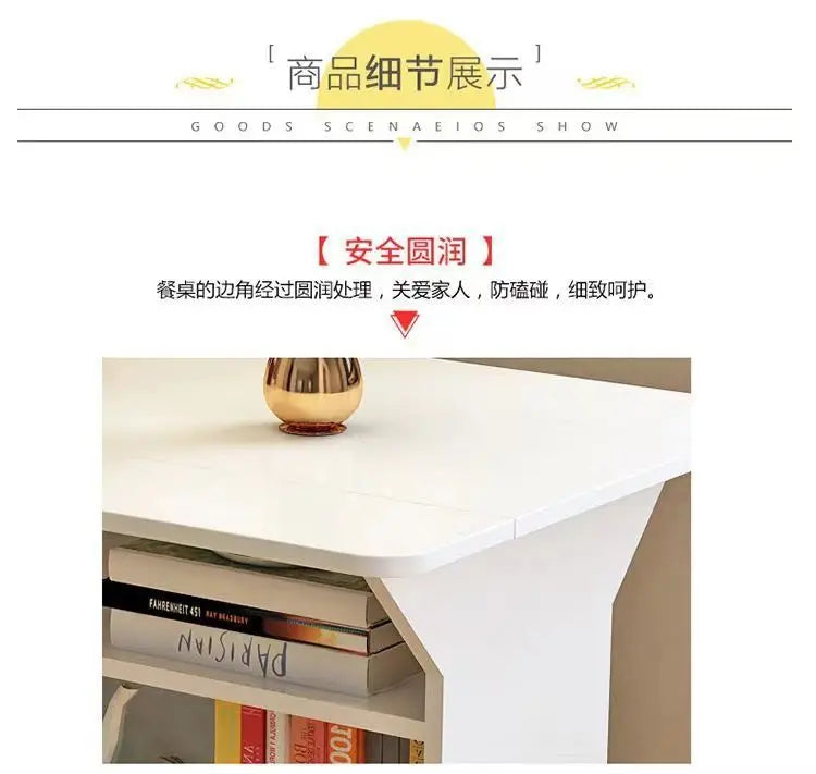 Masă de sufragerie pliabilă versatilă, cu rafturi integrate, care combină spațiul de luat masa cu spațiul de depozitare pentru a face camerele mai eficiente, ordonate și elegante.