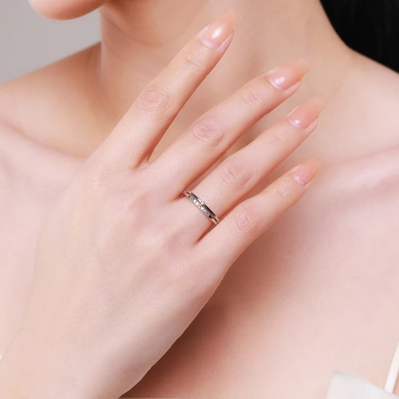 - Zirconiu în culorile curcubeului: Pietrele de zirconiu cubic, fixate precis, oferă accente subtile de culoare, fără a fi deranjante, și captează lumina într-un mod elegant.