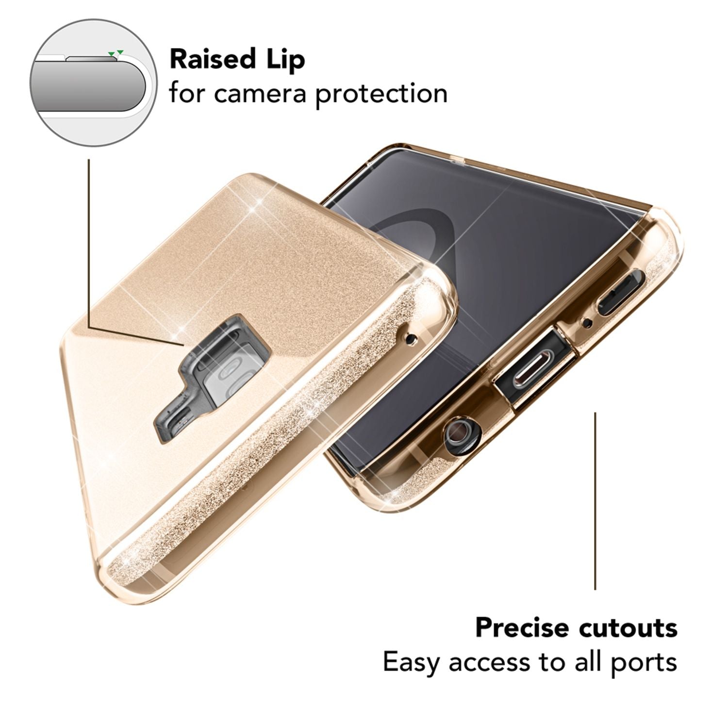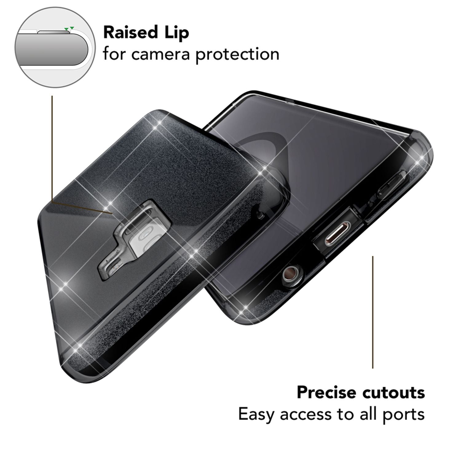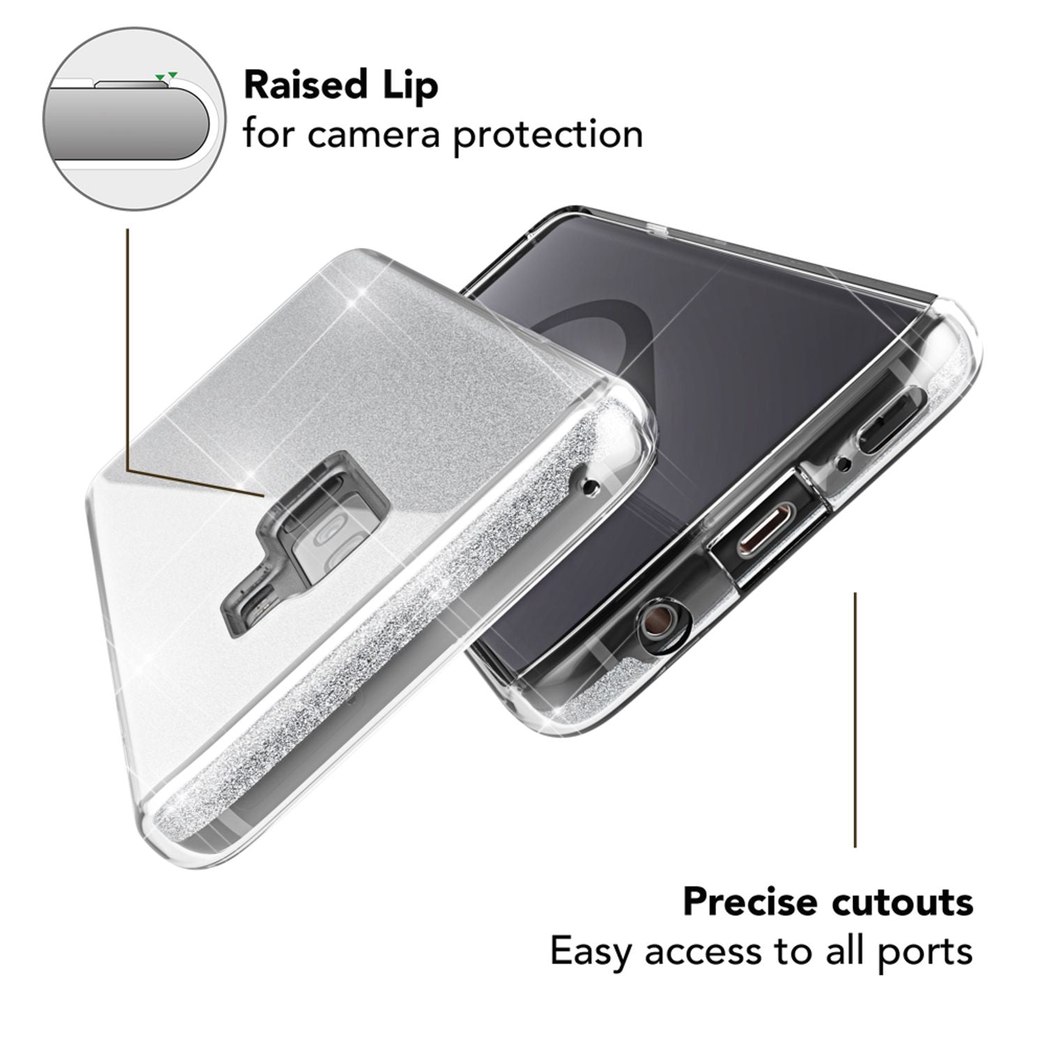 Dar frumusețea nu este suficientă – această husă îți protejează telefonul ca un scut ! Datorită combinației inteligente de TPU flexibil, plastic ranforsat și folie elegantă cu sclipici, dispozitivul tău rămâne în siguranță împotriva loviturilor și zgârieturilor. Un material special de etanșare asigură o strălucire de lungă durată – nu se exfoliază, nu se decolorează, nu se zgârie!