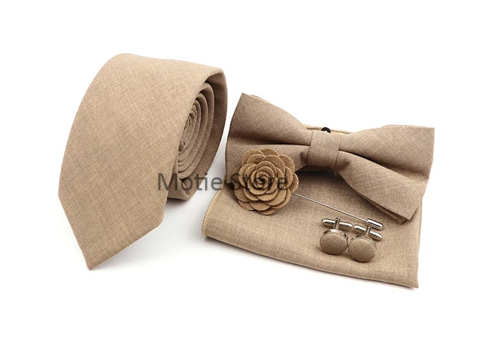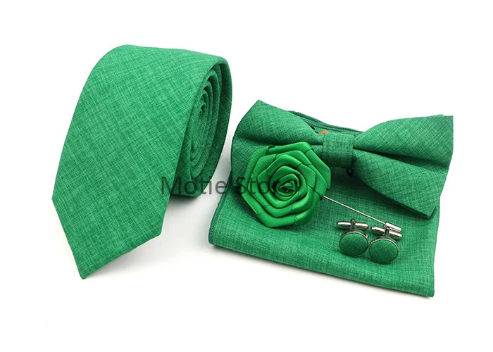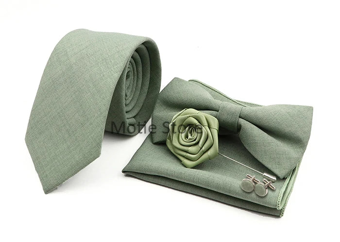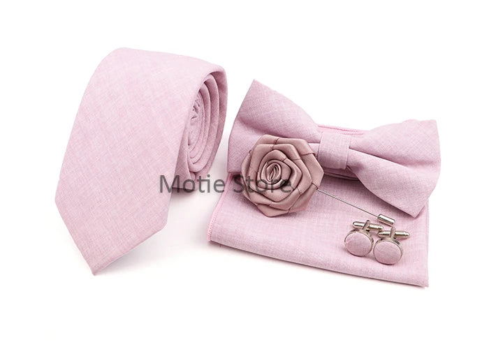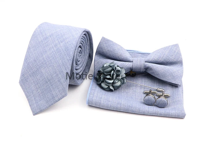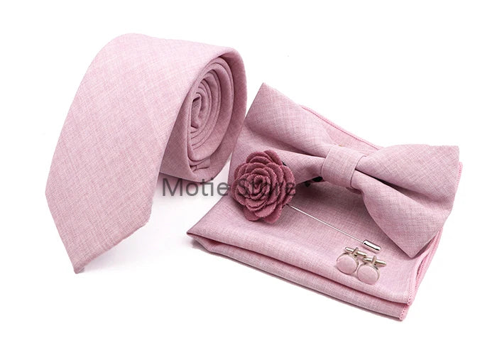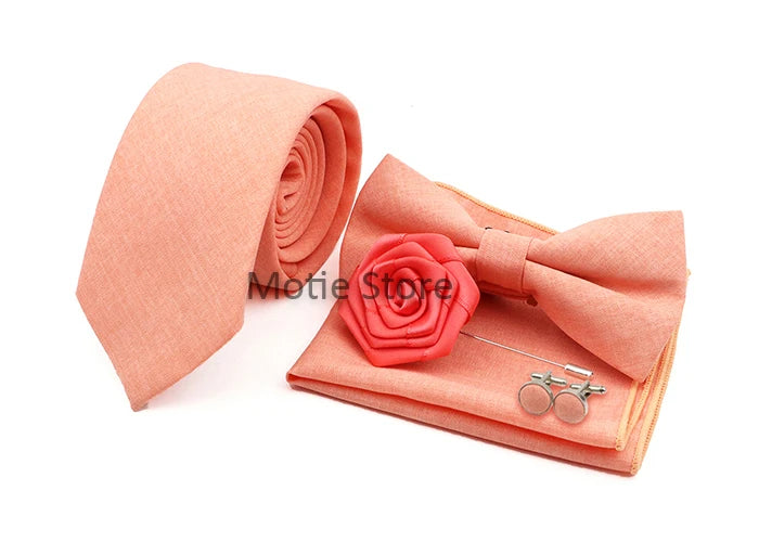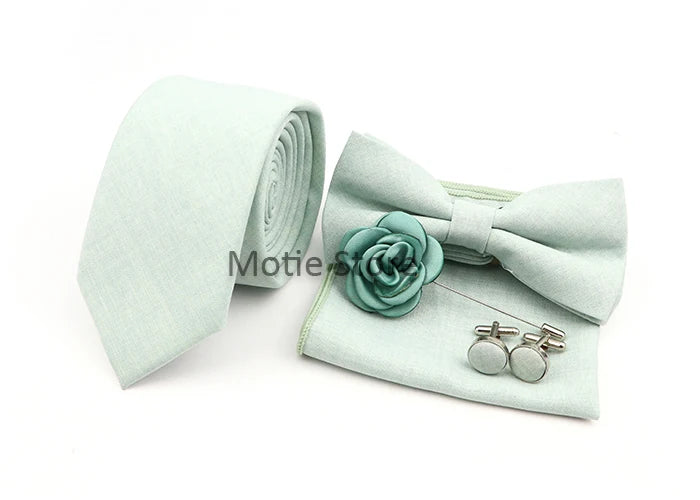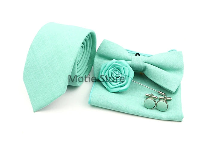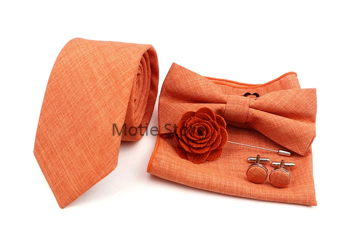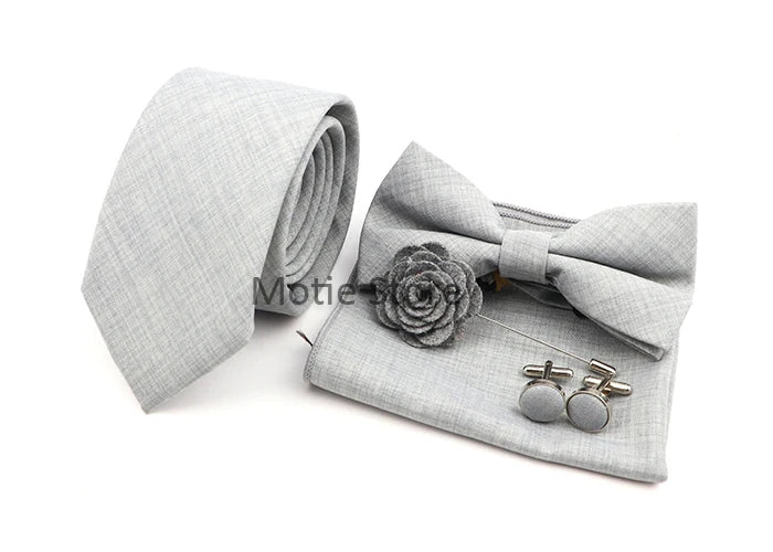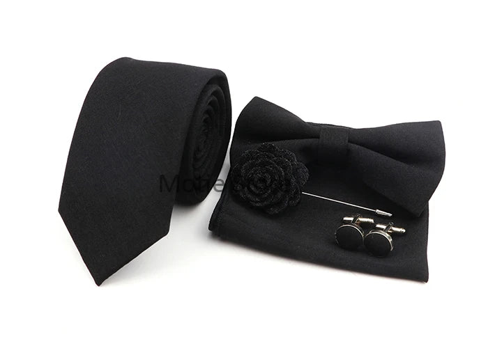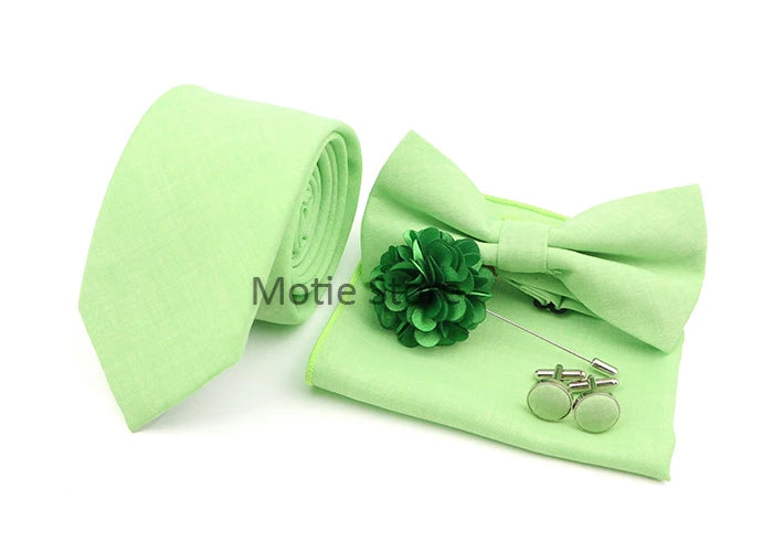 - Conținutul setului: Batistă de bumbac (fiecare culoare), papion, butoni