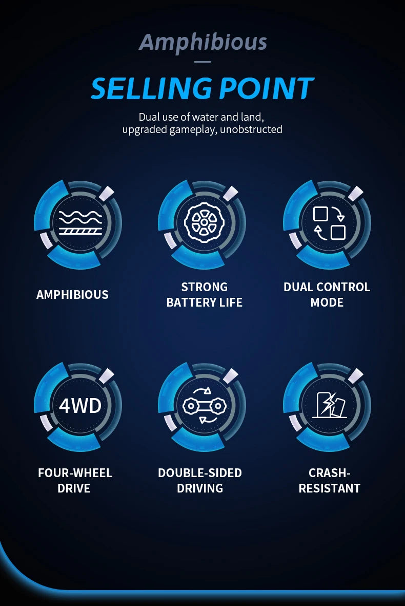 Acest vehicul RC face parte din categoriile Jucării cu telecomandă și Mașini și camioane cu telecomandă și este ideal pentru uz recreativ, provocări sportive și ca și cadou pentru copiii pasionați de tehnologie. Combinația dintre designul robust, ușurința în utilizare și capacitățile amfibii îl face o alegere atractivă pentru oricine caută o experiență RC fiabilă și distractivă.