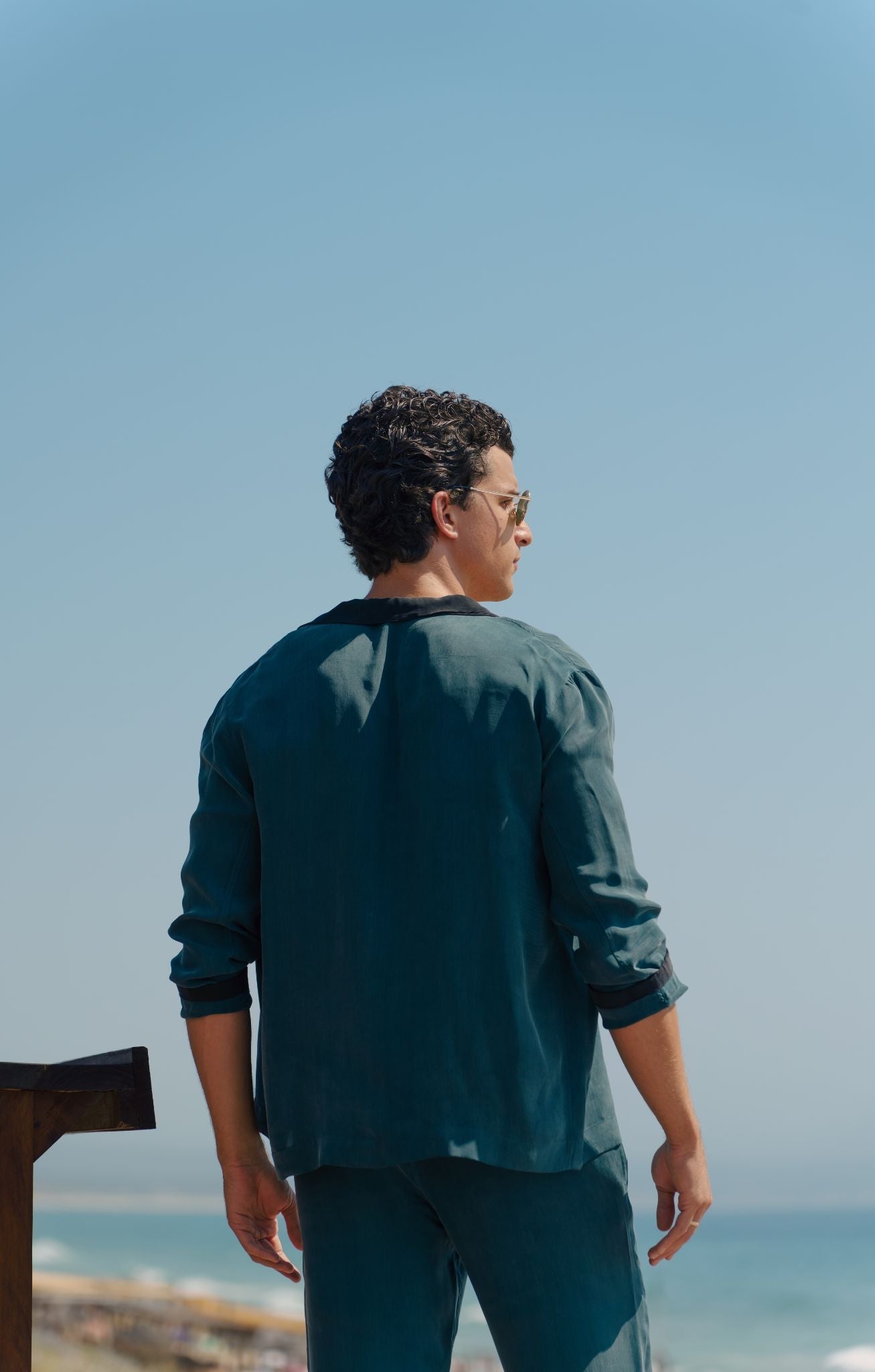 Elevate your relaxation wardrobe with our exquisitely crafted unisex pyjama set (top & bottom), meticulously made in Italy. This dark green ensemble, featuring subtle black elements, seamlessly blends comfort, style, and sustainability.