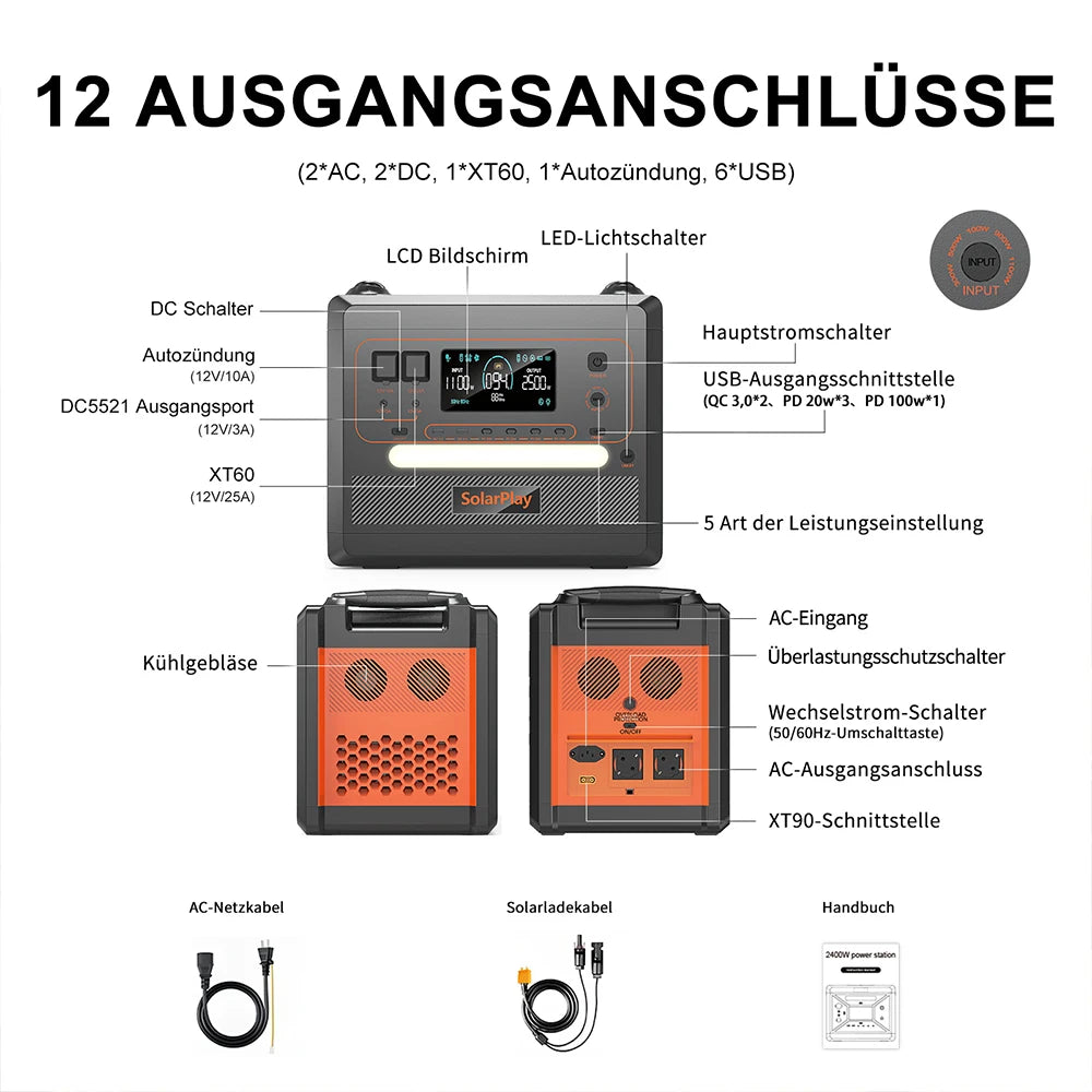 Powerstation 2025 - Q2402M Generator solar LiFePO4 2500W - Generator de curent de urgență cu undă sinusoidală pură, tip cărucior, cu 12 ieșiri