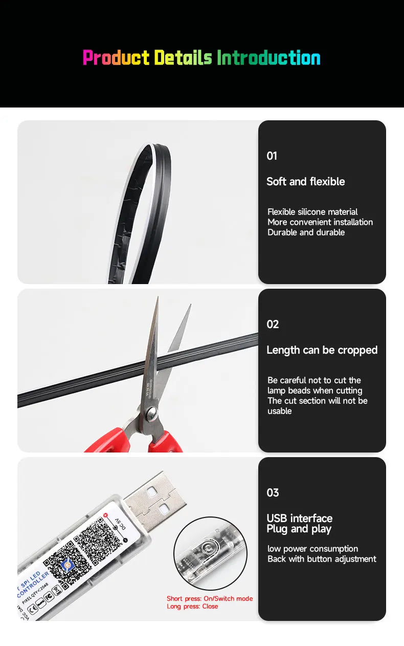 - Moduri multiple de control: control manual, schimbare automată a culorii și efecte sincronizate pentru diferite nevoi.