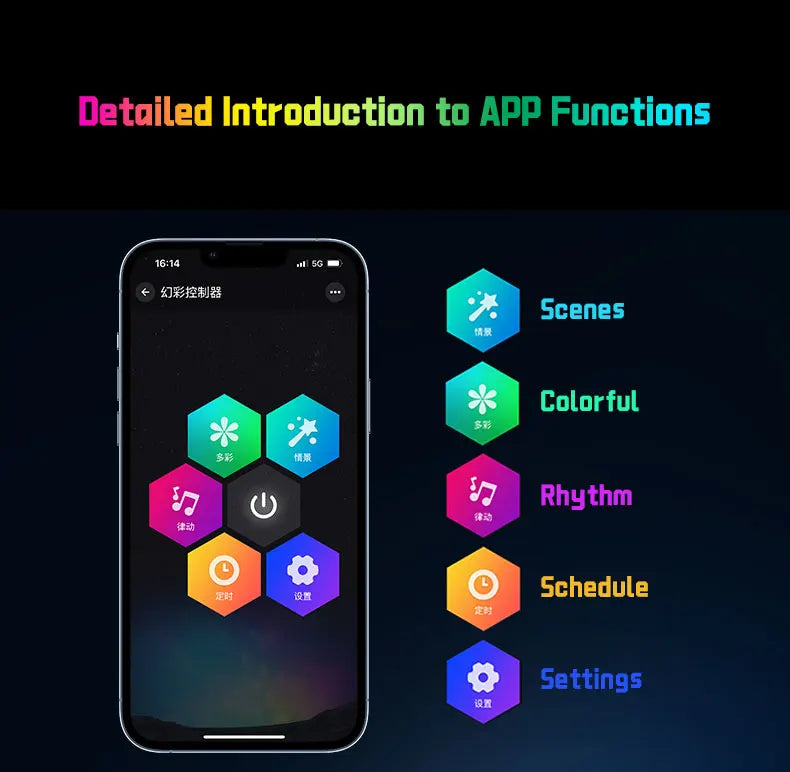 - Funcții: Selectarea culorilor, controlul luminozității, mod scenă, sincronizare muzică