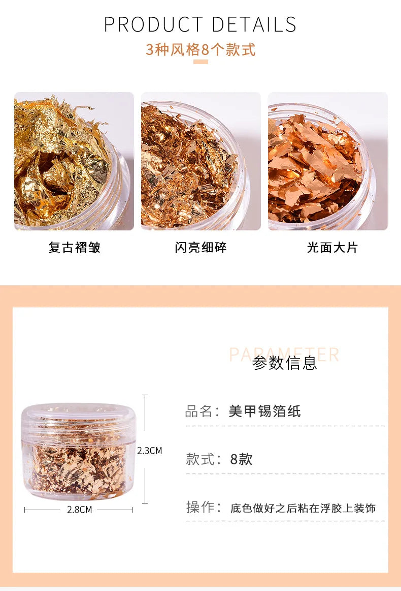 Aceste fragmente de folie sunt un accesoriu eficient pentru categoria de îngrijire a unghiilor și nail art, completând ofertele dvs. de cosmetice, îngrijire a unghiilor și accesorii de înfrumusețare. Combinația de aur roz și argint creează look-uri versatile, potrivite atât pentru designuri subtile, cât și pentru cele izbitoare. Aplicarea ușoară face produsul atractiv atât pentru începători, cât și pentru tehnicienii experimentați.
