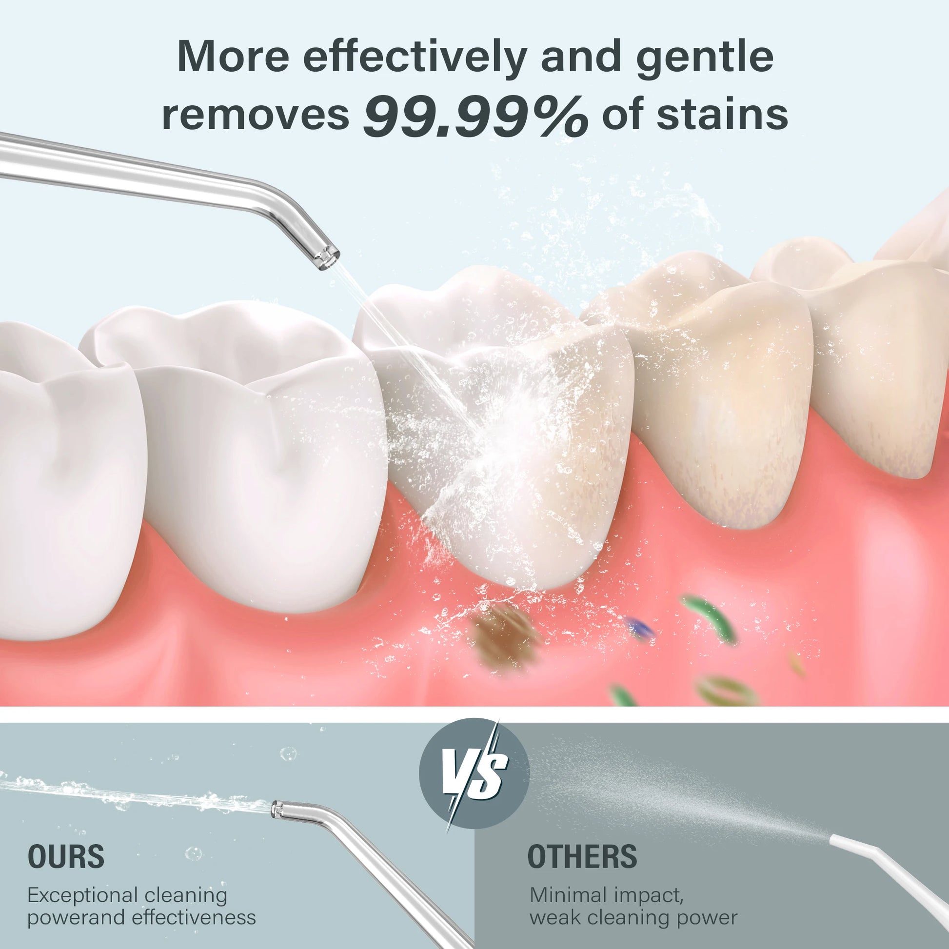 - Patru duze interschimbabile permit utilizarea de către mai multe persoane sau în scopuri diferite (de exemplu, spații interdentare, îngrijirea aparatului dentar, curățarea implanturilor).