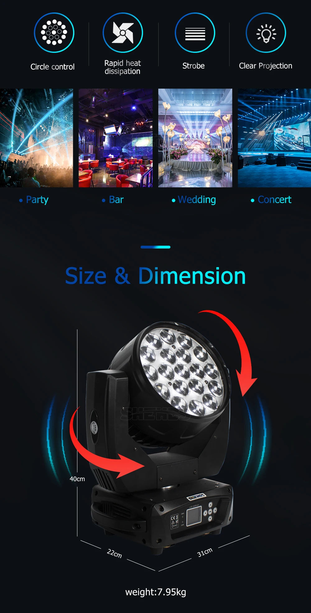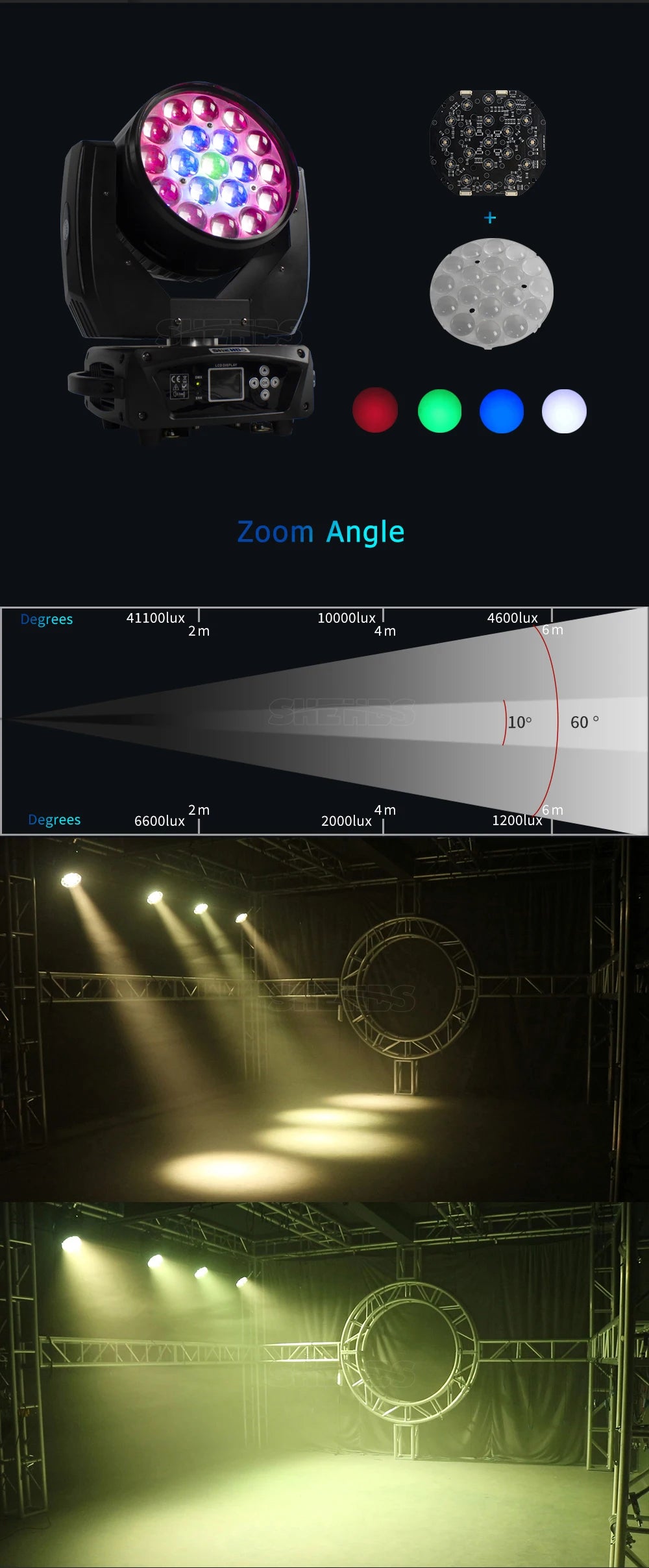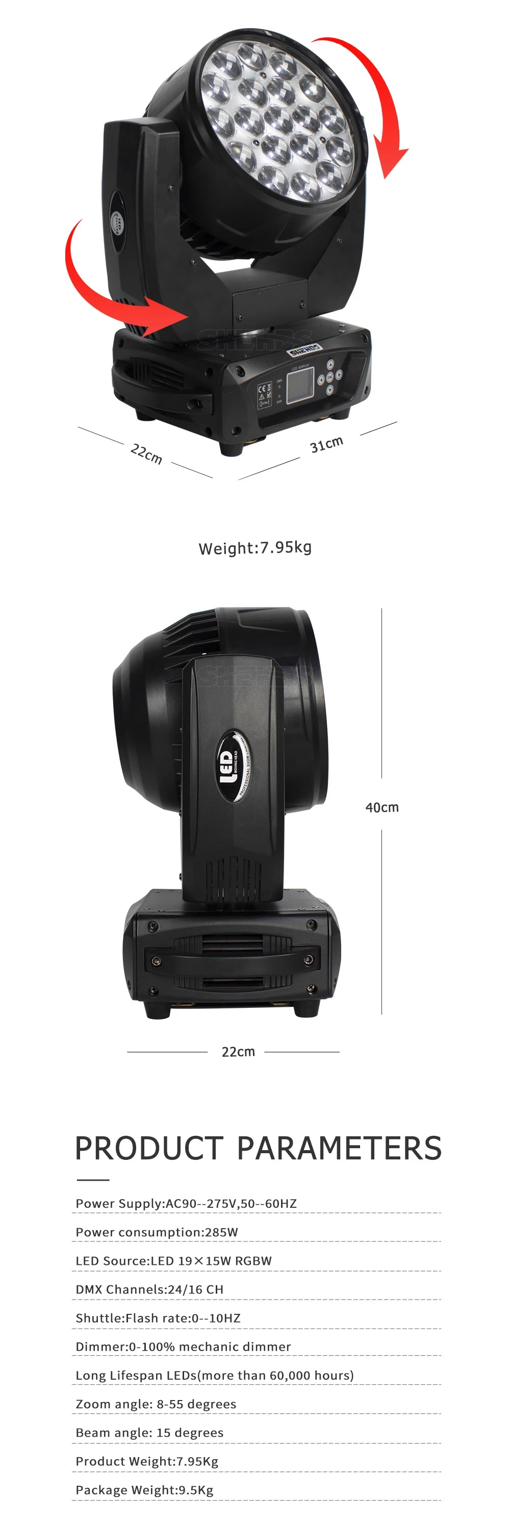 Cap mobil SHEHDS LED Zoom 19x15W RGBW – Fascicul puternic și efect de wash pentru spectacole impresionante