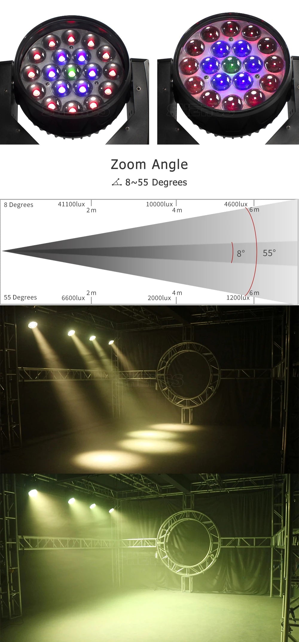 - Gamă de zoom variabilă: permite fascicule înguste pentru efecte clare și câmpuri de spălare largi pentru iluminarea scenei pe suprafețe mari.