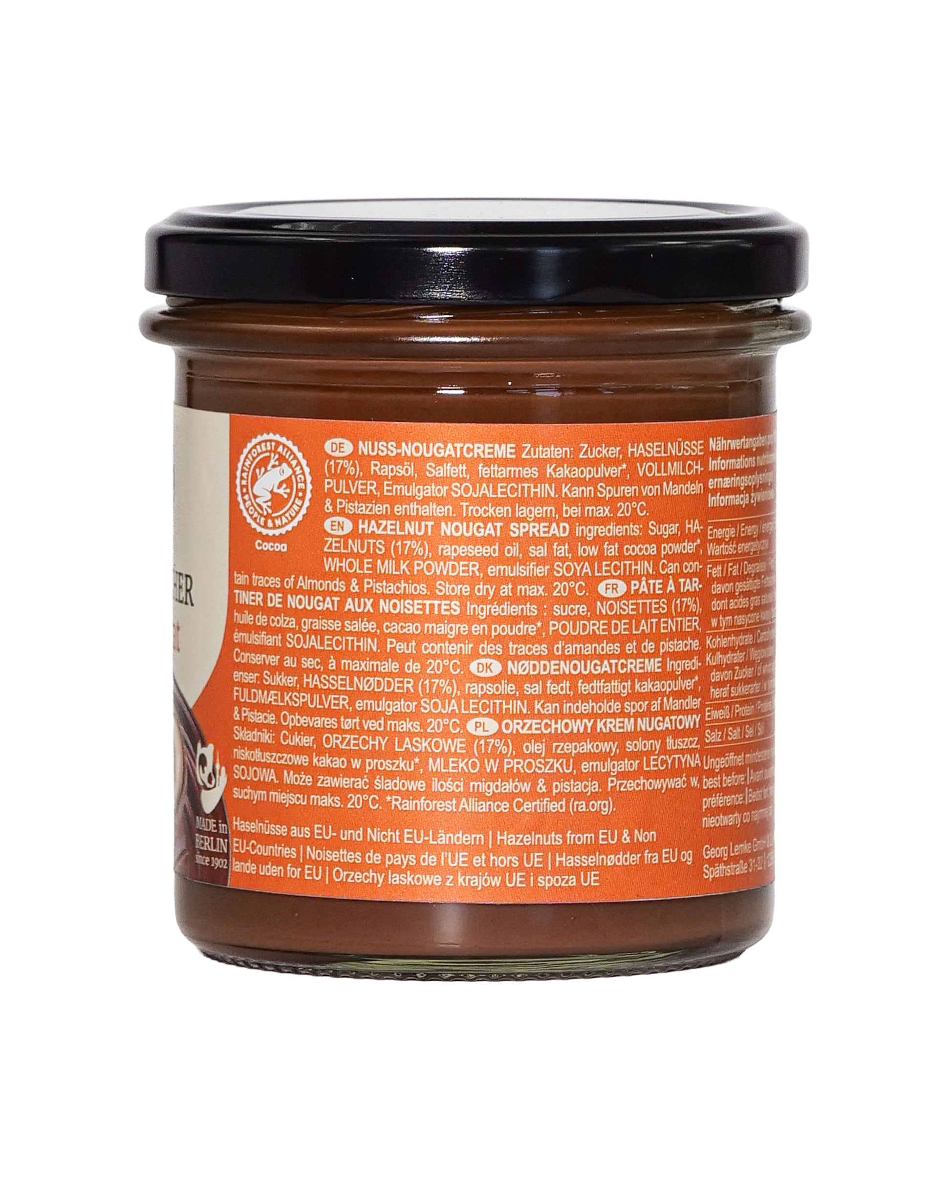 Crema de nuga cu alune de pădure Stadtstreicher este mai mult decât o simplă cremă dulce: este o delicatesă versatilă care se integrează ușor în viața de zi cu zi, îmbogățind micul dejun, deserturile și produsele de patiserie. Cu conținutul ridicat de alune de pădure, consistența cremoasă și producția meticuloasă de către Lemke Fine Berlin Marzipan & More, primiți un produs care impresionează atât prin gust, cât și prin ușurința în utilizare. Comandați acum și experimentați cum o cremă premium de nuga cu alune de pădure vă extinde posibilitățile culinare și transformă fiecare moment într-o încântare.