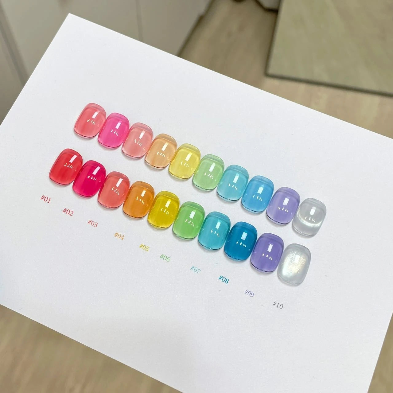 - 10 x sticluțe de ojă gel (câte 15 ml fiecare) în nuanțe transparente Jelly și Clear
