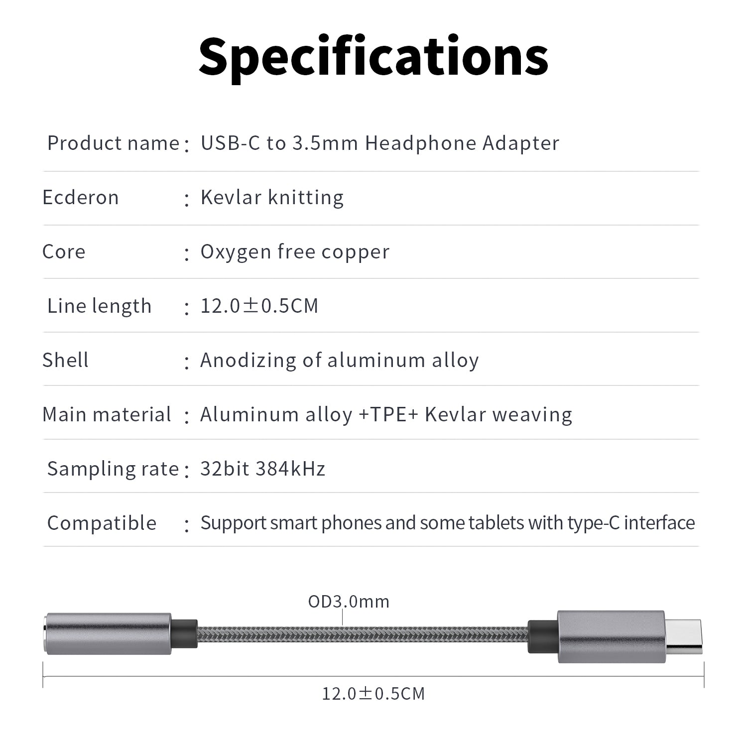 Adaptor pentru căști DREIKS USB-C HiFi DAC - Rezoluție 384 kHz/32 biți, 48 kHz/16 biți, Design compact