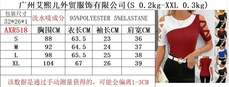 Tricou femei T-shirt Slim Color Block Office Fashion Street Top Hollow mânecă scurtă strâmtă tricouri pentru femei